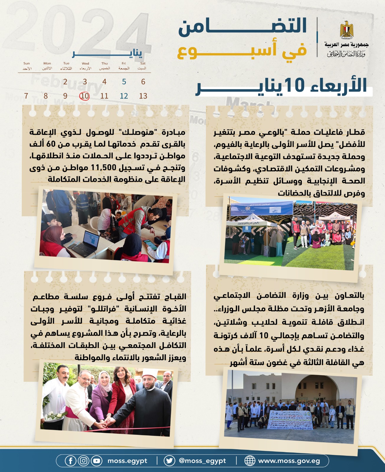 - صندوق مكافحة وعلاج الادمان يحتفى بمتطوعيه شركاء النجاح، بحملة موسعة على مواقع التواصل الاجتماعي بعنوان "٣٦٥ يوم تطوع" وعرض مجهودات متطوعي الصندوق خلال عام ٢٠٢٣ بالمحافظات المختلفة.- برنامج تكافل وكرامة ينفذ دراسة تقييمية مع شركة "أثر"، لتقييم رأي المستفيدين في خدمات الاستجابة والصرف الشهري للدعم النقدي