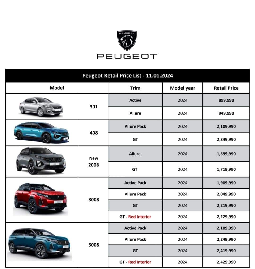 وشملت قائمة أسعار سيارات بيجو موديل 2024 الجديدة الصادرة عن شركة مانسكو أوتوموتيف، طرازات «301، و408، ونيو 2008، و3008، و5008».