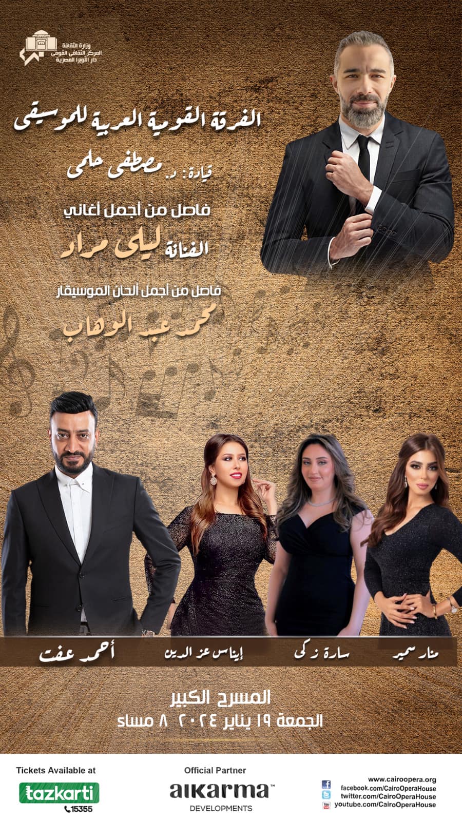 تستعد الفرقة القومية العربية للموسيقي، بقيادة د. مصطفي حلمي، لاحياء حفلاً غنائيًا يوم الجمعة المقبل الموافق 19 يناير المقبل على المسرح الكبير بدار الأوبرا المصرية، ومن المقرر أن يتم حجز تذاكر الحفل عن طريق شركة "تذكرتى".