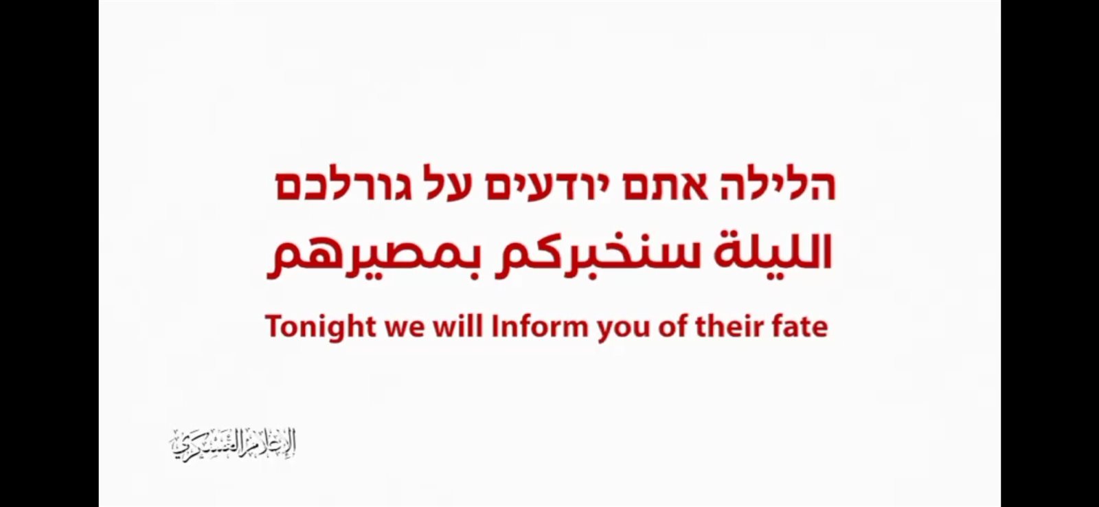 قالت القسام فى الفيديو الجديد الذي نشرته: "ماذا تعتقدون؟ هل قتلوا، أم قتل بعضهم ونجي الآخر، الليلة سنخبركم مصيرهم".