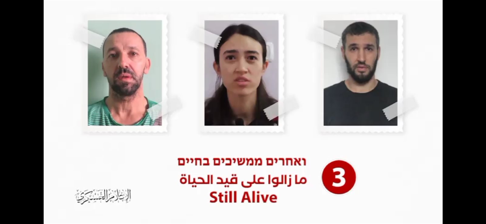 نشرت كتائب القسام مقطع فيديو للأسرى الثلاثة نوعى ارغاماني وإيتاي صابرسكي ويوسي شرابي، وكانت قالت أمس إنها ستعلن مصيرهم اليوم الإثنين، مستخدمة أسلوب الحرب النفسية الذي اعتاد الاحتلال الإسرائيلي استخدامه، موضحة أنه سيتم الكشف الليلة عن مصيرهم.