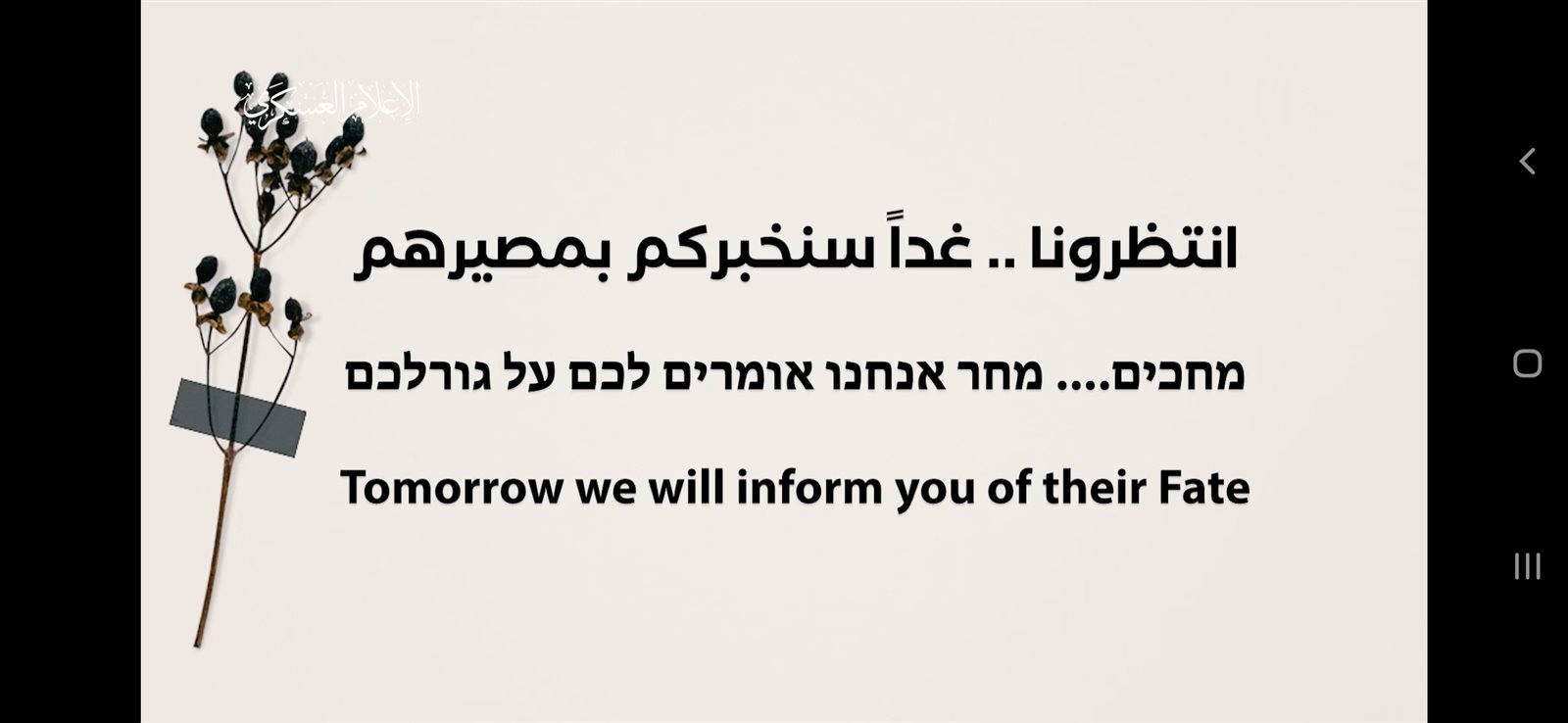 وفي نهاية الفيديو قالت حماس "سنخبركم مصيرهم غدا حكومتكم تكذب".