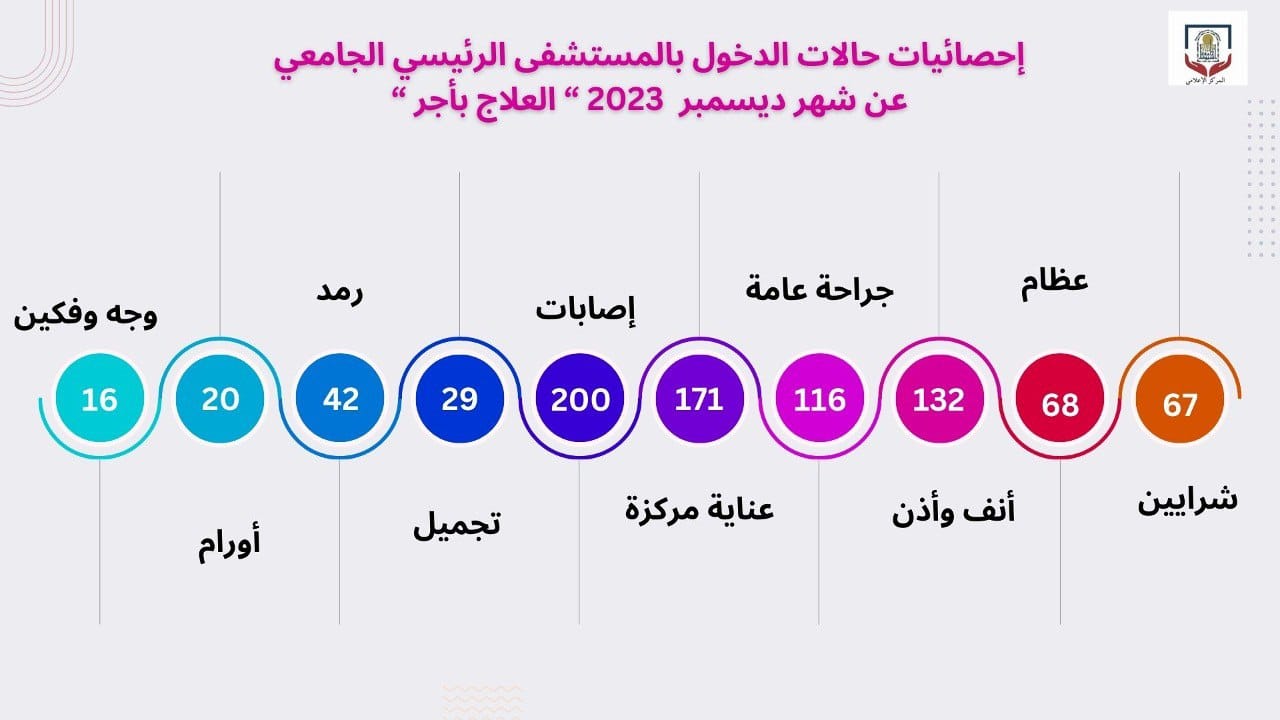 وأعلن المستشفى عن استقبال 200 حالة دخول بقسم الإصابات، و171 حالة دخول بالعناية المركزة، و116 حالة بقسم الجراحة العامة، إلى جانب تسجيل 132 حالة دخول بقسم الأنف والأذن والحنجرة، و67 حالة دخول بقسم الشرايين خلال الشهر نفسه.