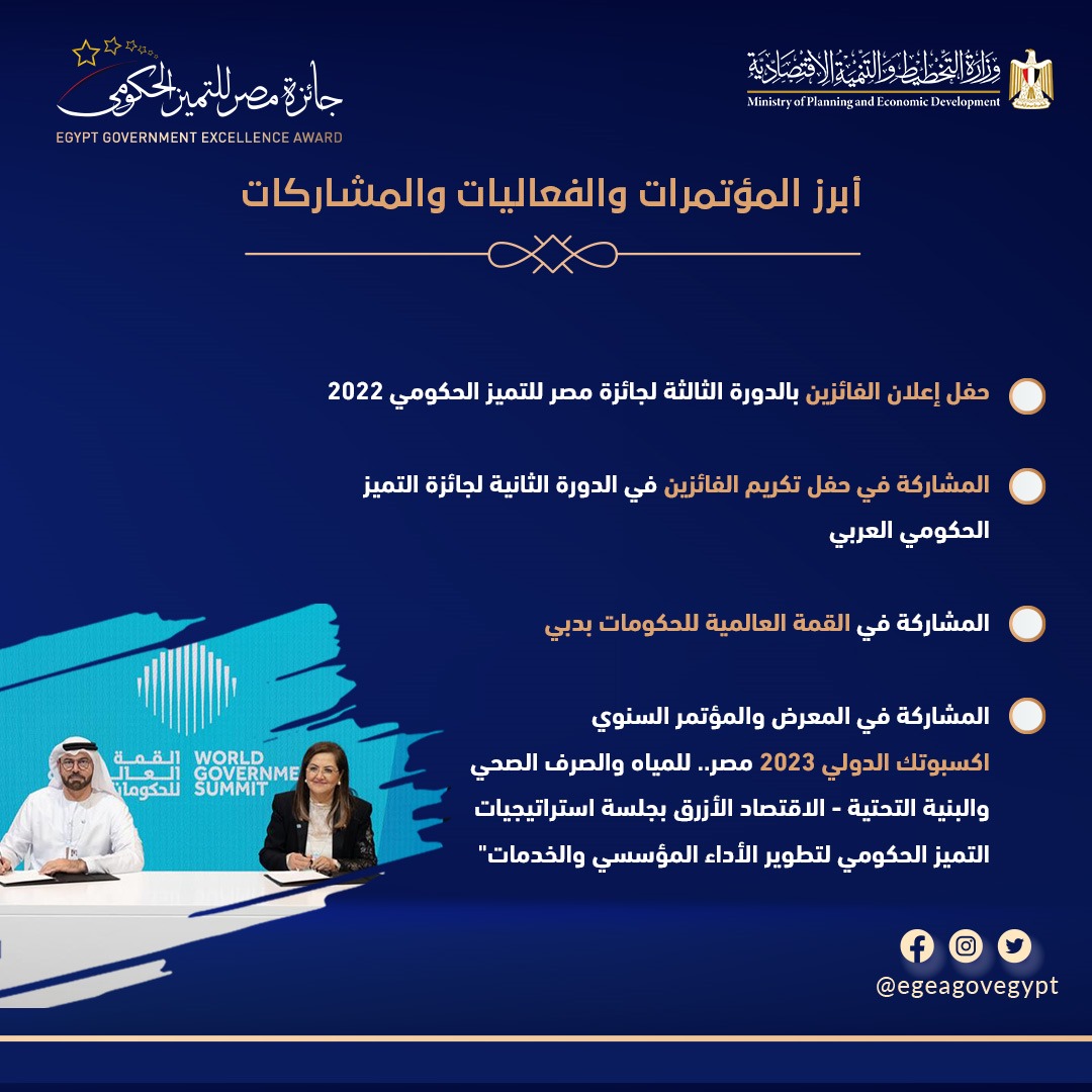 أضاف التقرير أن جائزة مصر للتميز الحكومي شاركت في عدد من المؤتمرات والفاعليات، منها حفل تكريم الفائزين في الدورة الثانية للجائزة والتي شهدت تكريم 21 فائزًا على مستوى الوطن العربي لتحصد مصر 3 جوائز؛ حيث فازت هيئة قناة السويس بجائزة أفضل هيئة حكومية عربية، ومشروع الخط الثالث لمترو الأنفاق عن أفضل مشروع حكومي عربي لتطوير البنية التحتية، في حين فاز اللواء أشرف عبدالباري، محافظ أسوان بجائزة أفضل محافظ عربي، إضافة إلى المشاركة في القمة العالمية للحكومات بدبي، وكذلك بجلسة "استراتيجيات التميز الحكومي لتطوير الأداء المؤسسي والخدمات" على هامش فعاليات المعرض والمؤتمر السنوي اكسبوتك الدولي 2023 "مصر.. للمياه والصرف الصحي والبنية التحتية- الاقتصاد الأزرق".