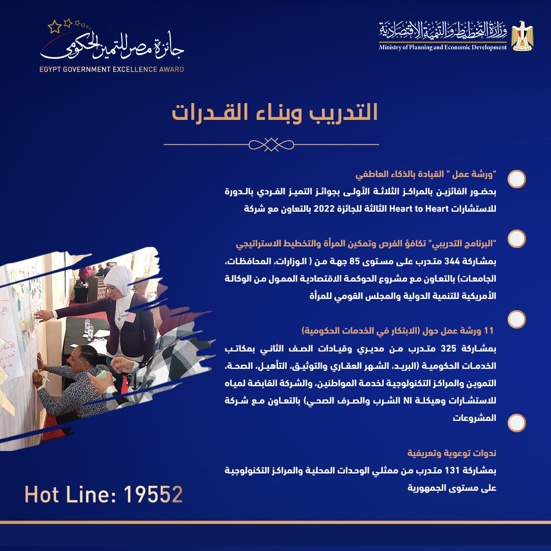 واستمرارا في نشر التوعية وبناء القدرات المرتبطة معايير التميز المؤسسي عقدت إدارة الجائزة عدة ورش عمل وبرامج تدريبية للجهات المختلفة، ومنها ورشة عمل "القيادة بالذكاء العاطفي" والتي تم تقديمها لعدد 15 متدربًا من الفائزين بالمراكز الثلاثة الأولى بجوائز التميز الفردي بالدورة الثالثة للجائزة 2022 بالتعاون مع شركة Heart to Heart للاستشارات، والبرنامج التدريبي "تكافؤ الفرص وتمكين المرأة والتخطيط الاستراتيجي" بمشاركة 344 متدربًا على مستوى 85 جهة من (الوزارات، المحافظات، الجامعات) بالتعاون مع مشروع الحوكمة الاقتصادية الممول من الوكالة الأمريكية للتنمية الدولية والمجلس القومي للمرأة، بالإضافة إلى عقد 11 ورشة عمل حول (الابتكار الخدمات الحكومية) بمشاركة 325 متدربًا من مديري وقيادات الصف الثاني مكاتب الخدمات الحكومية، لتشمل (البريد، الشهر العقاري والتوثيق، التأهيل، الصحة، التموين والمراكز التكنولوجية لخدمة المواطنين، والشركة القابضة لمياه الشرب والصرف الصحي) بهدف بناء الجاهزية للابتكار الحكومي في تقديم الخدمات الحكومية والتعرف على المبادئ الأساسية للتفكير التصميمي وبالتعاون مع شركة NI للاستشارات وهيكلة المشروعات، وعقد ندوات توعوية وتعريفية بمشاركة 131 متدربًا من ممثلي الوحدات المحلية والمراكز التكنولوجية على مستوى الجمهورية.