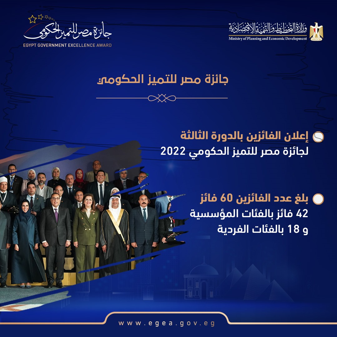 وأشار التقرير إلى أن الربع الأول من العام 2023 شهد إعلان أسماء الفائزين بالدورة الثالثة لجائزة مصر للتميز الحكومي 2022، خلال فعاليات حفل توزيع جوائز التميز الحكومي، تحت رعاية السيد الرئيس عبد الفتاح السيسي رئيس الجمهورية، وبحضور وتشريف السيد رئيس مجلس الوزراء الدكتور مصطفي مدبولي، د. هالة السعيد وزيرة التخطيط والتنمية الاقتصادية، ومعالي مريم الحمادي، وزيرة دولة والأمين العام لمجلس الوزراء بالإمارات، وبمشاركة عدد من السادة الوزراء والمحافظين والسفراء وعدد من أعضاء المجالس النيابية، وممثلي دولة الإمارات العربية الشقيقة، حيث بلغ عدد الفائزين 60 فائز (42 فائزًا بالفئات المؤسسية و18 بالفئات الفردية).