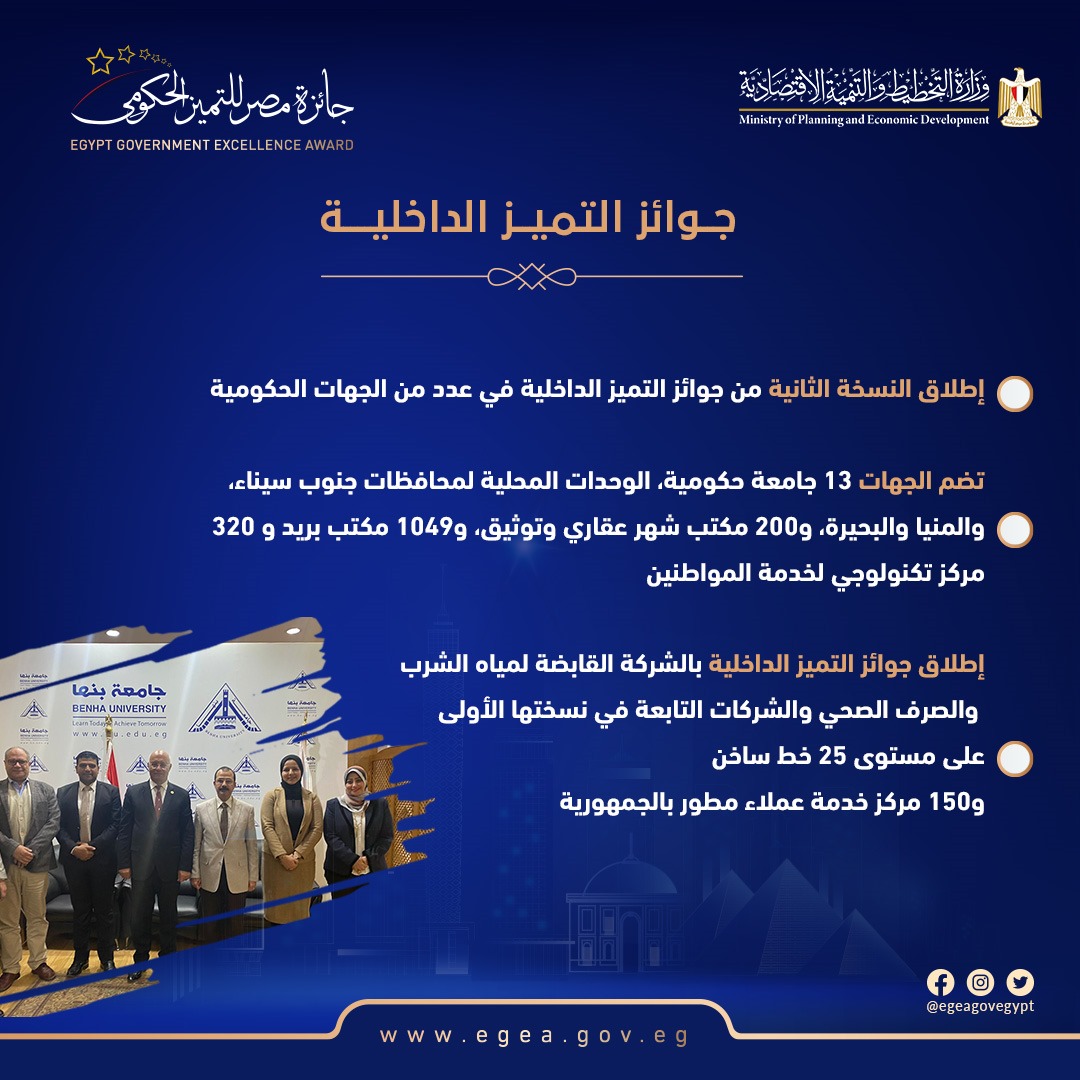 وحول جوائز التميز الداخلية، أوضح التقرير أنه تم إطلاق النسخة الثانية لها في عدد من الجهات الحكومية وذلك بهدف تنمية القدرات البشرية وإحداث نقلة نوعية في الأداء المؤسسي، والعمل على تأهيل الجهات للمشاركة في الجائزة الوطنية "جائزة مصر للتميز الحكومي" لتضم عدد 13 جامعة من إجمالي 27 جامعة مصرية حكومية، الوحدات المحلية لعدد 3 محافظات (جنوب سيناء، المنيا والبحيرة)، وعن الوحدات الخدمية شهدت مشاركة 200 مكتب شهر عقاري وتوثيق، 1049 مكاتب بريد و320 مركزًا تكنولوجيًا لخدمة المواطنين إضافة إلى إطلاق جوائز التميز الداخلية بالشركة القابضة لمياه الشرب والصرف الصحي والشركات التابعة في نسختها الأولى على مستوى 25 خط ساخن و150 مركز خدمة عملاء مطور بالجمهورية وفى مبادرة الأولى من نوعها كأول قطاع حكومي خدمي.