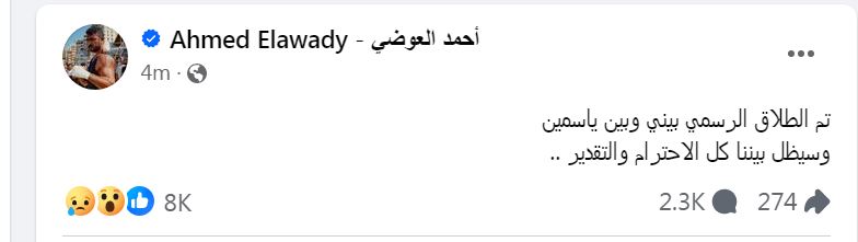 جاء إعلان الطلاق عند كل من أحمد العوضي وياسمين عبد العزيز بنفس الصياغة الكتابية “تم الطلاق الرسمي بيني وبين ياسمين وسيظل بيننا كل الاحترام والتقدير”، عبر حسباتهما الرسمية على مواقع التواصل الإجتماعي فيسبوك وانستجرام،