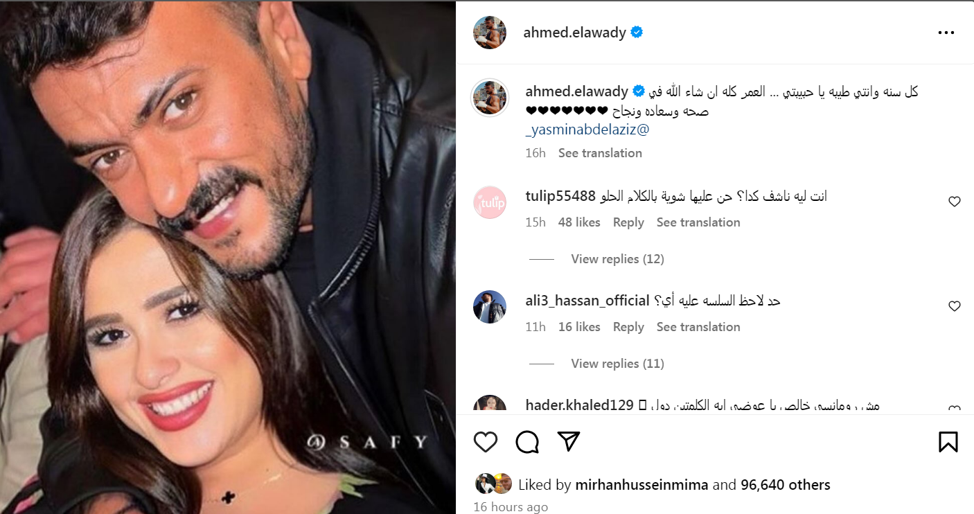 قبل تصديق الخبر من عدمه، هناك عدد من التساؤلات حول حالة إعلان الطلاق وموعده، خاصةً ان العوضي هنأ ياسمين عبد العزيز خلال الساعات القليلة الماضية بعيد ميلادها بكل دعوات الحب والرومانسية مناديًا إياها بـ “حبيبتي”،
