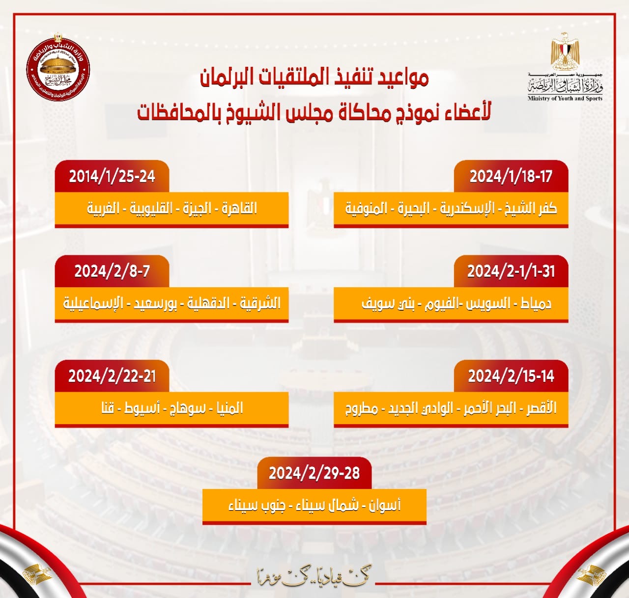 أعلنت وزارة الشباب والرياضة ، من خلال الإدارة المركزية للتعليم المدني _ الإدارة العامة لبرلماني الطلائع والشباب ، بالشراكة مع مديريات الشباب والرياضة بمحافظات الجمهورية ، عن مواعيد تنفيذ مُلتقيات برلمانية لأعضاء نموذج محاكاة مجلس الشيوخ ، خلال الفترة من 17 يناير الجاري حتي الــ29 من فبراير المقبل ، بمشاركة 28 ألف عضو من أعضاء النموذج .
