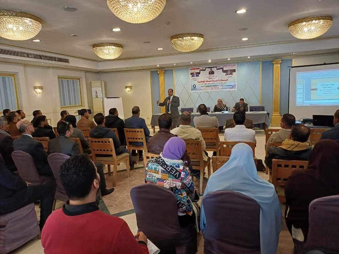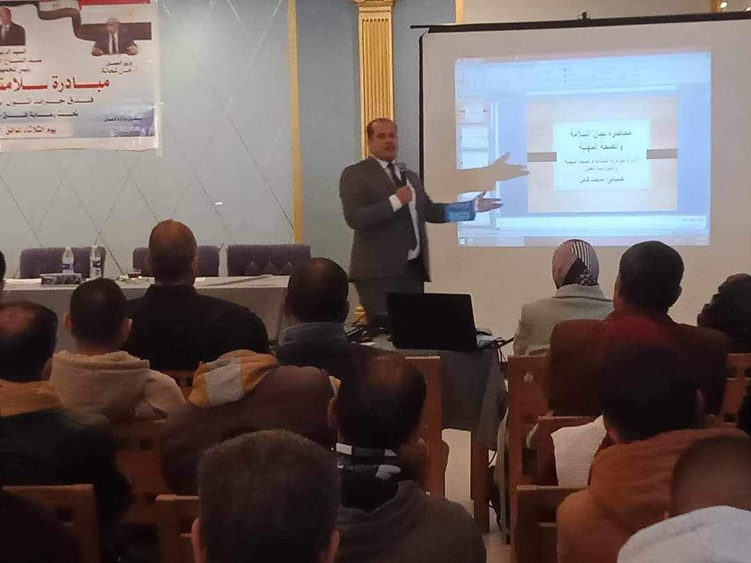 ألقى المحاضرة الأولى منها المهندس مدحت كامل من الادارة المركزية للسلامة والصحة المهنية وتأمين بيئة العمل بالوزارة حول كيفية تشكيل لجان السلامة والصحة المهنية وكيفية تشكيل الاجهزة الوظيفية للسلامة ،وما هي القواعد والإجراءات اللازمة لتدريبهم، وما هو دور كل من لجنه السلامة والجهاز الوظيفي في الحفاظ علي العمال من الحوادث والإصابات والحفاظ علي المنشآت ورأس المال وذلك لسير العملية الانتاجية وزيادة الإنتاج وزيادة الدخل للعاملين، كما تطرق أيضا للحديث عن ماهي تصاريح العمل وأهميتها وانواعها ، وما هي الإجراءات المتبعه عند إصدار تصاريح العمل.