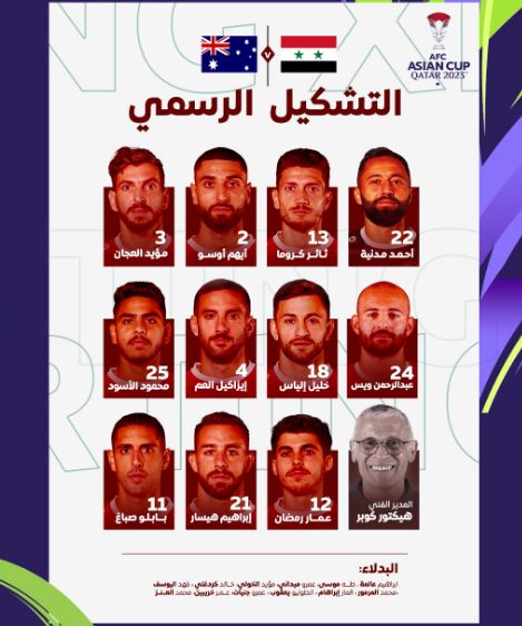 أعلن الجهاز الفني لمنتخب سوريا بقيادة الأرجنتيني هيكتور كوبر تشكيل نسور قاسيون لمواجهة أستراليا اليوم الخميس، على ملعب جاسم بن حمد في ثاني جولات دور المجموعات لبطولة كأس آسيا المقامة في قطر.