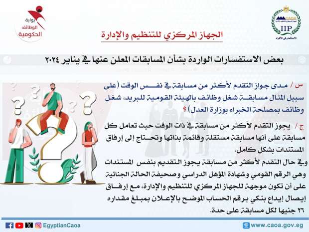 في حال التقدم لأكثر من مسابقة يجوز التقديم بنفس المستندات، وهي الرقم القومي وشهادة المؤهل الدراسي وصحيفة الحالة الجنائية على أن تكون موجهة للجهاز المركزي للتنظيم والإدارة، مع إرفاق إيصال الإيداع بنكي برقم الحساب الموضح بالإعلان بمبلغ مقداره 26 جنيهًا لكل مسابقة على حدة.