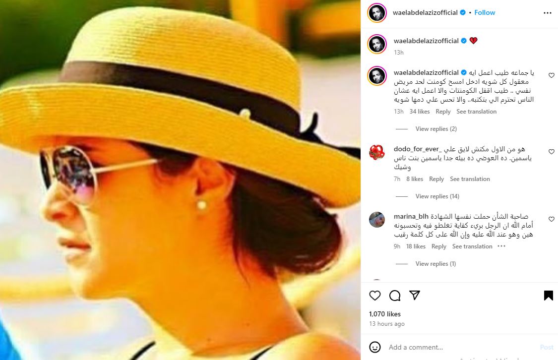 أثار وائل عبد العزيز شقيق ياسمين عبد العزيز جدلًا واسعًا بتصرف غير مفهوم بعد ساعات من طلاق شقيقته من أحمد العوضي، حيث قام بنشور صورة لها واكتفى بوضع "قلب مكسور" عليها، وذلك عبر حسابه الشخصي بموقع تبادل الصور والفيديوهات "انستجرام"، ما أثار استفزاز متابعيه متسائلين عن هدفه من المنشور.