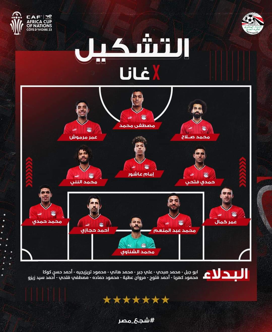 وأعلن البرتغالي روي فيتوريا المدير الفني لمنتخب مصر الأول لكرة القدم عن تشكيل الفراعنة في مواجهة البلاك ستارز على النحو التالي: