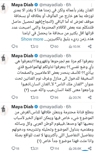 واختتمت مايا رسالتها قائلة: "أما الباقي (النجاح) فهو تحصيل حاصل، فلتتكلّم عنه بعض الأقلام المحترمة والتي أصبحت عدد قرّائها اقل بكثير من سخافة ما يحصل في ايامنا هذه..زمن رديء يليق بالكثيرين وليس الكل".