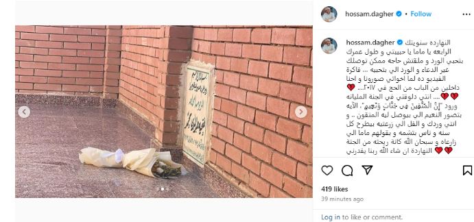 وشارك الفنان حسام داغر، جمهوره مقطع فيديو له برفقة والدته، وعلق عليه قائلًا : "النهاردة سنويتك الرابعة يا ماما يا حبيبتي وطول عمرك بتحبي الورد وملقتش حاجة ممكن توصلك غير الدعاء والورد اللي بتحبيه.. فاكرة الفيديو ده لما أخواتي صورونا وإحنا داخلين من الباب من الحج في 2017".