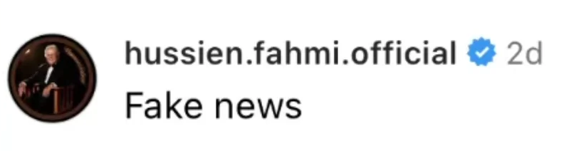 وعلق حسين فهمي على فيديو مزاعم زواجه بكلمة واحدة قائلًا: " Fake News، أخبار غير حقيقية"، لينفي بهذا التعليق زواجه من الموديل مريم علاء، الذي زعمه البعض بعد تداول صورة رومانسية تجمعهما وهي تحتضنه داخل إحدى الصالات الرياضية.