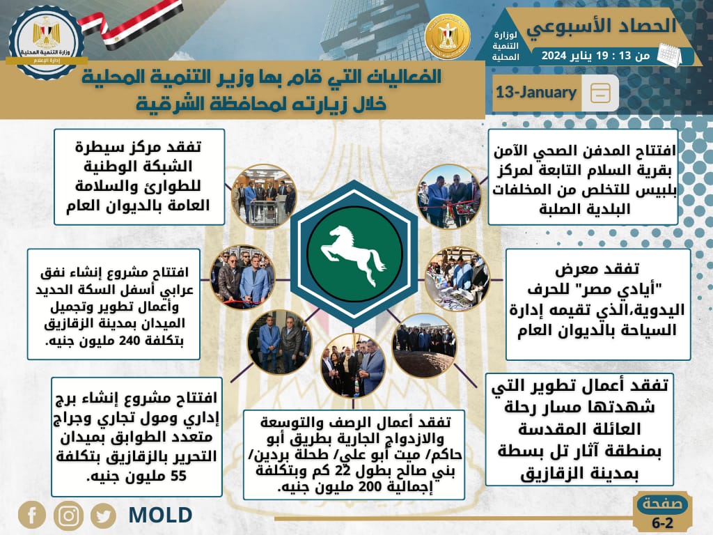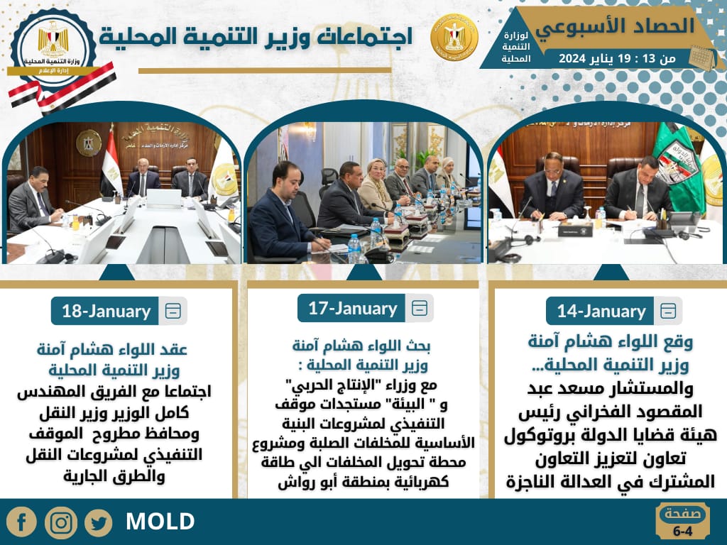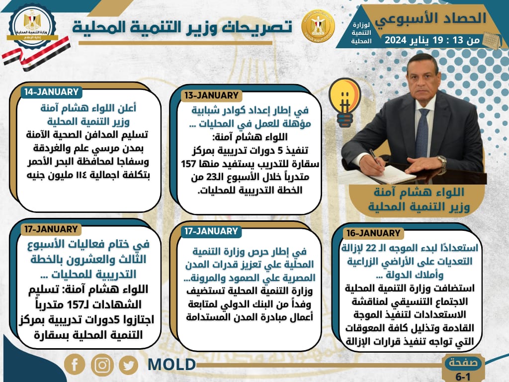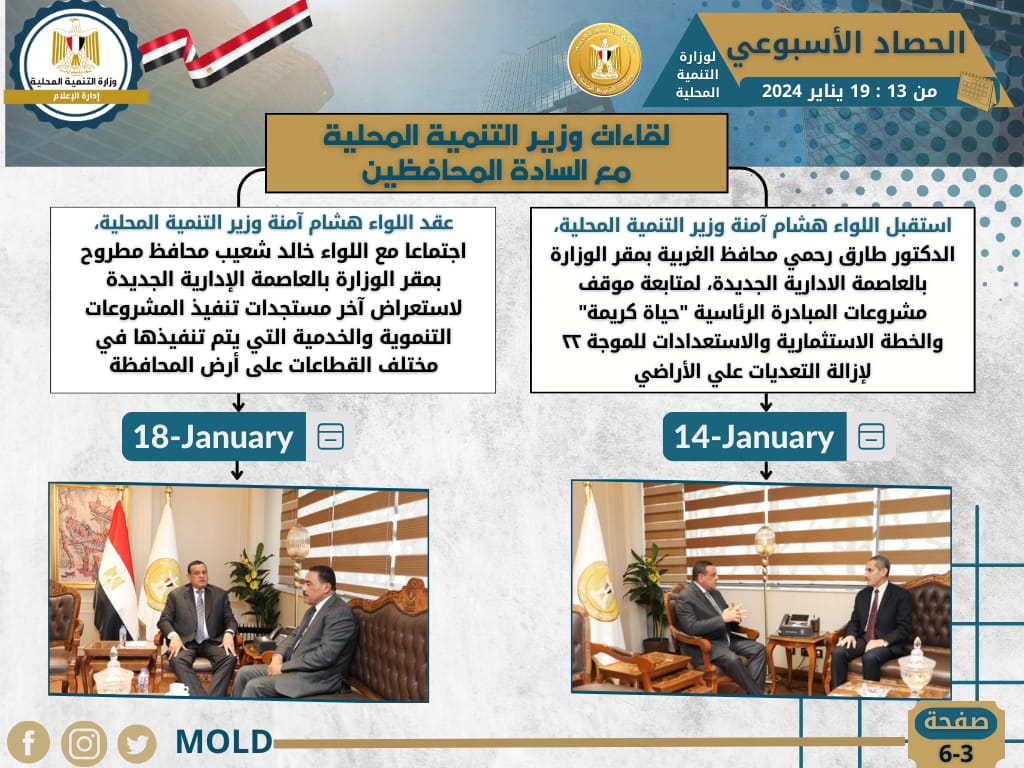 أصدر المركز الإعلامي التابع لوزارة التنمية المحلية، "الانفوجراف الأسبوعي" في نسخته الـ 70 حول حصاد أهم الأنشطة والفعاليات التي قام بها اللواء هشام آمنة وزير التنمية المحلية، خلال الأسبوع الماضي في الفترة من 13 حتى 19 يناير الجاري 2024، حيث نستعرض أبرزها في التقرير التالي الذي نشرته الصفحة الرسمية لوزارة التنمية المحلية على موقع التواصل الاجتماعي "فيس بوك" من خلال انفوجراف يرصد أبرز تلك الأنشطة التي جاءت كالتالي: