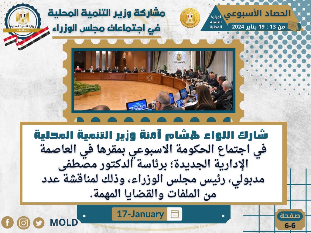 كما شارك اللواء هشام آمنة وزير التنمية المحلية في اجتماع الحكومة الأسبوعي بمقرها في العاصمة الإدارية الجديدة؛ برئاسة الدكتور مصطفى مدبولي، رئيس مجلس الوزراء، وذلك لمناقشة عدد من الملفات والقضايا المهمة، وشدد رئيس الوزراء خلال الاجتماع على ضرورة تكثيف زيارات الوزراء لمواقع العمل والإنتاج خاصة مشروعات القطاع الخاص والعمل على حل أية مشكلات.