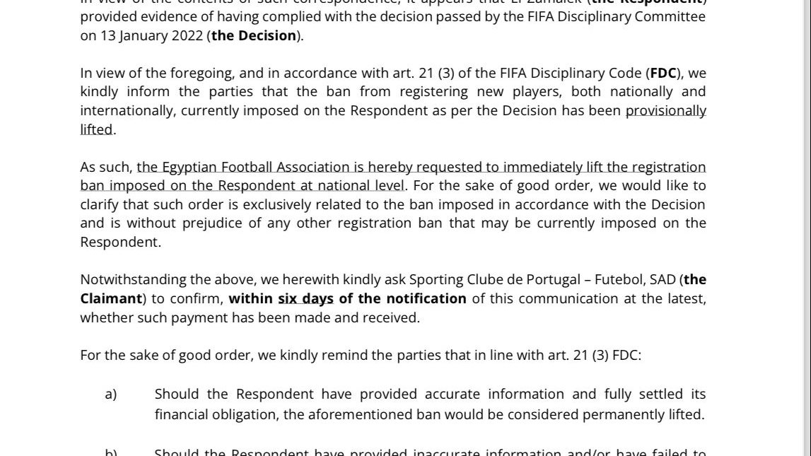 أرسل الإتحاد الدولي لكرة القدم الفيفا خطابا برفع القيد عن نادى الزمالك بعد تلقي خطاب من سبورتنج لشبونه بإنهاء أزمته مع نادى الزمالك بحصوله علي الغرامه الموقعه على شيكابالا بمبلغ مليون ونصف المليون دولار وه ماأدى إلى صدور قرار من الفيفا برفع الإيقاف الخاص بالقيد عن فريق الكرة.