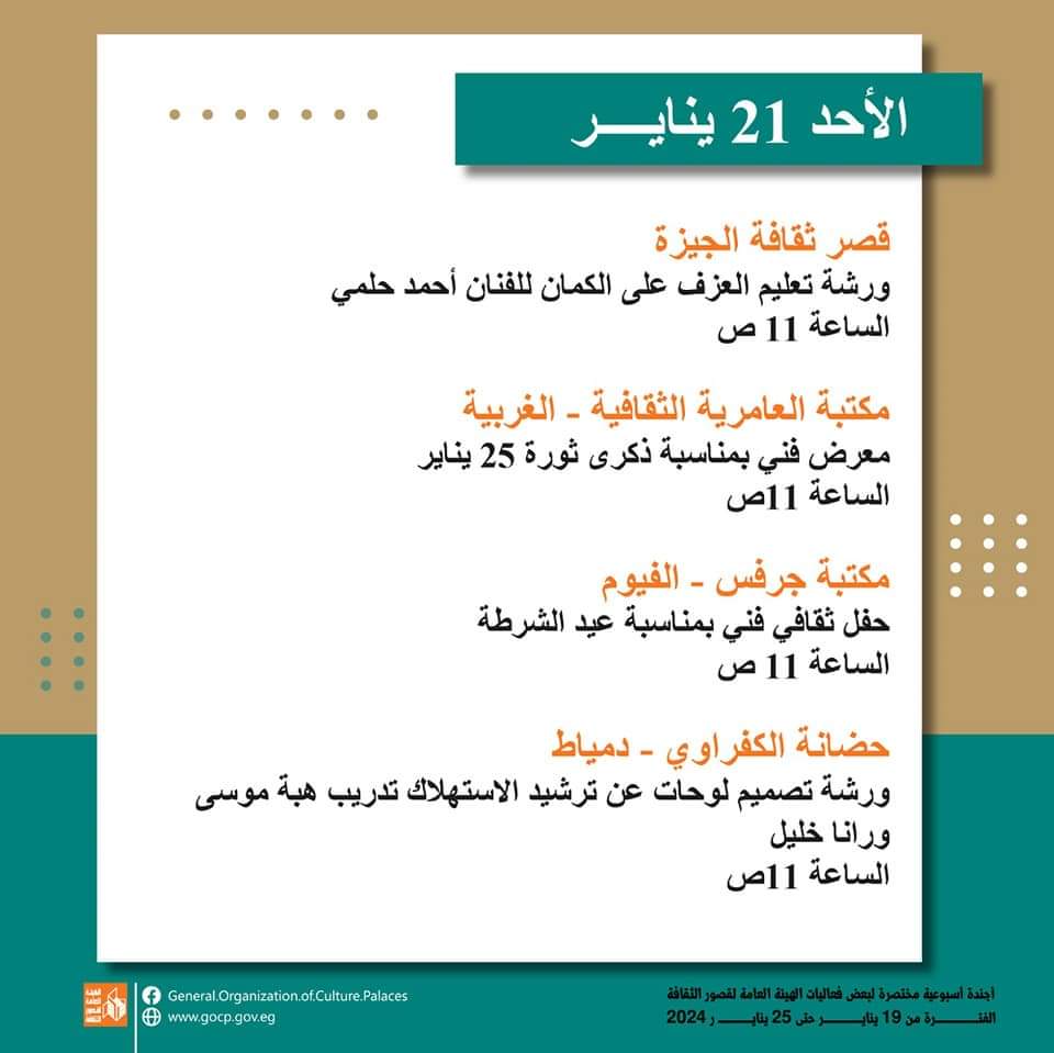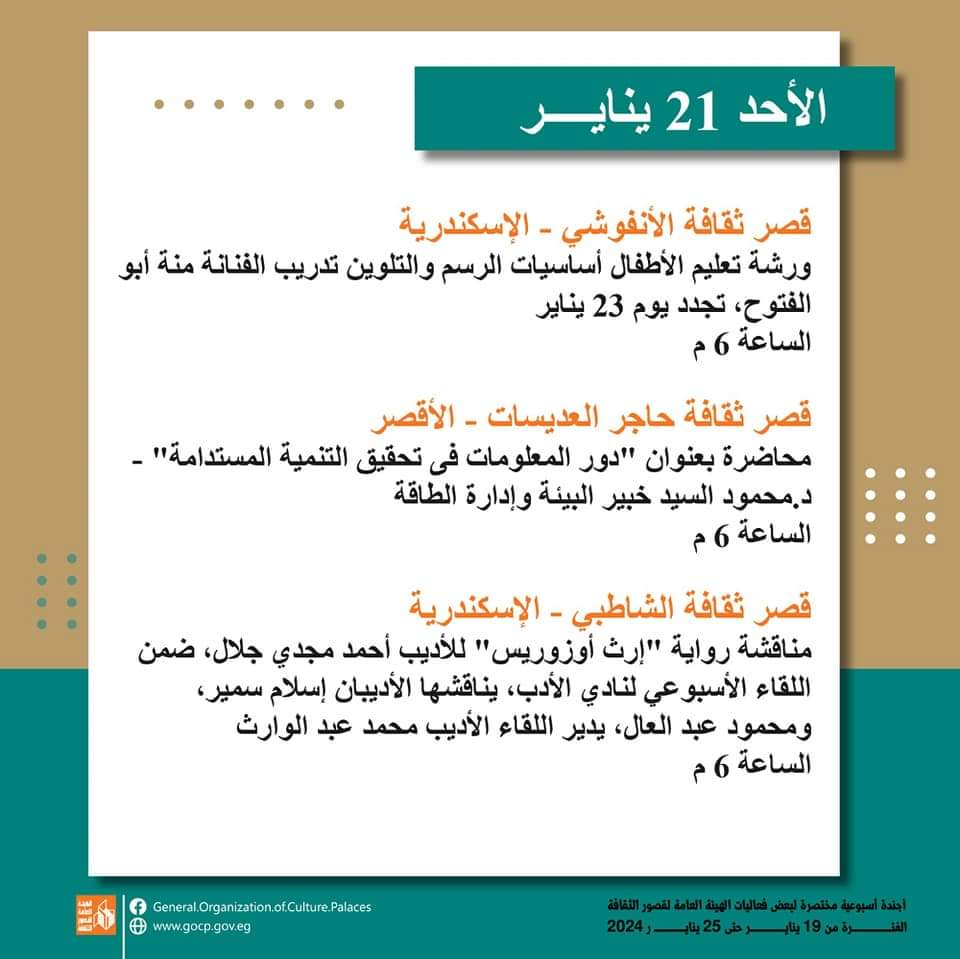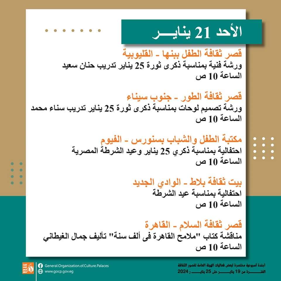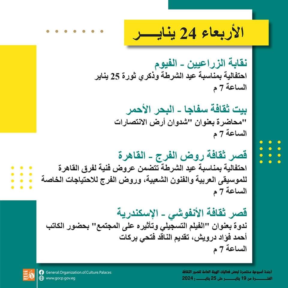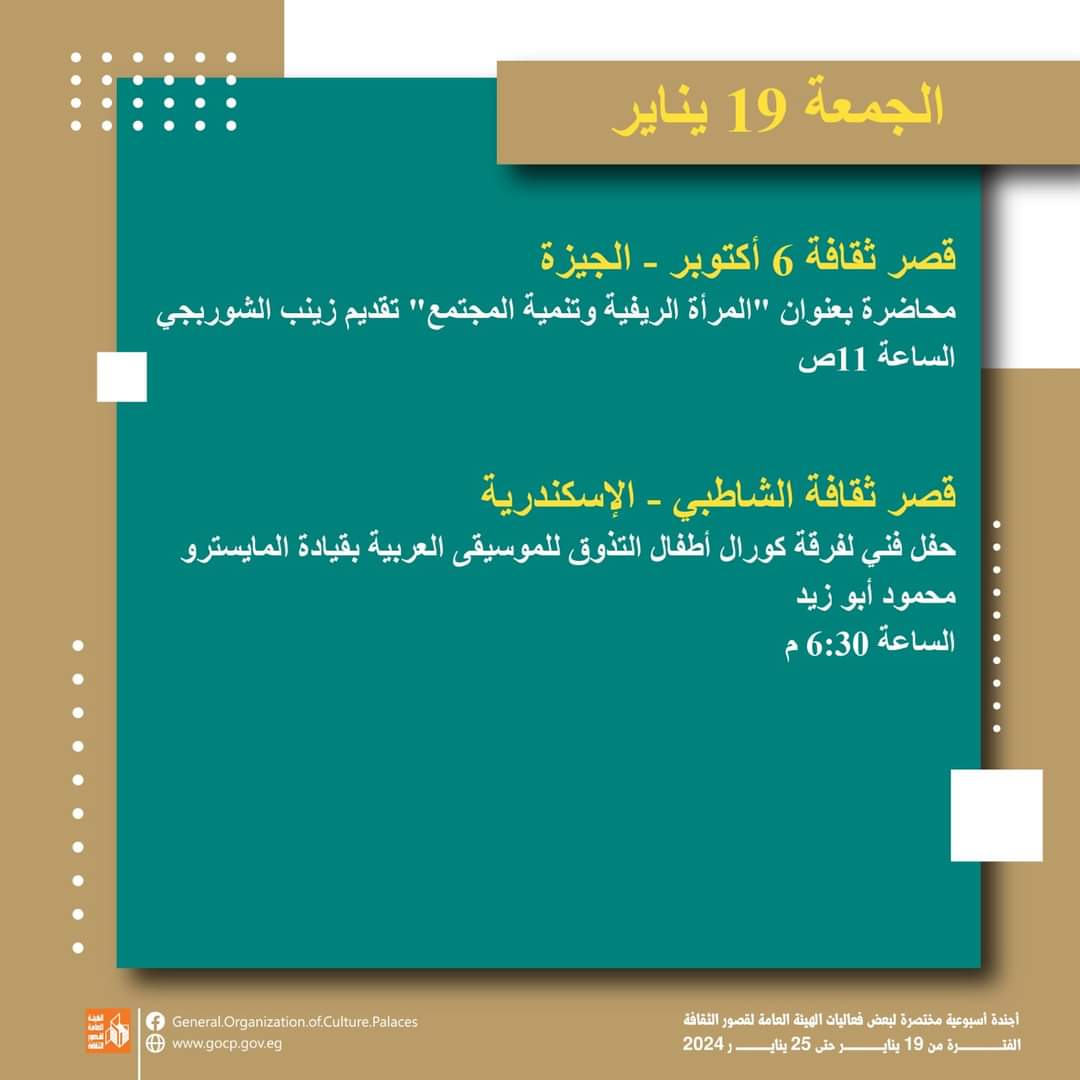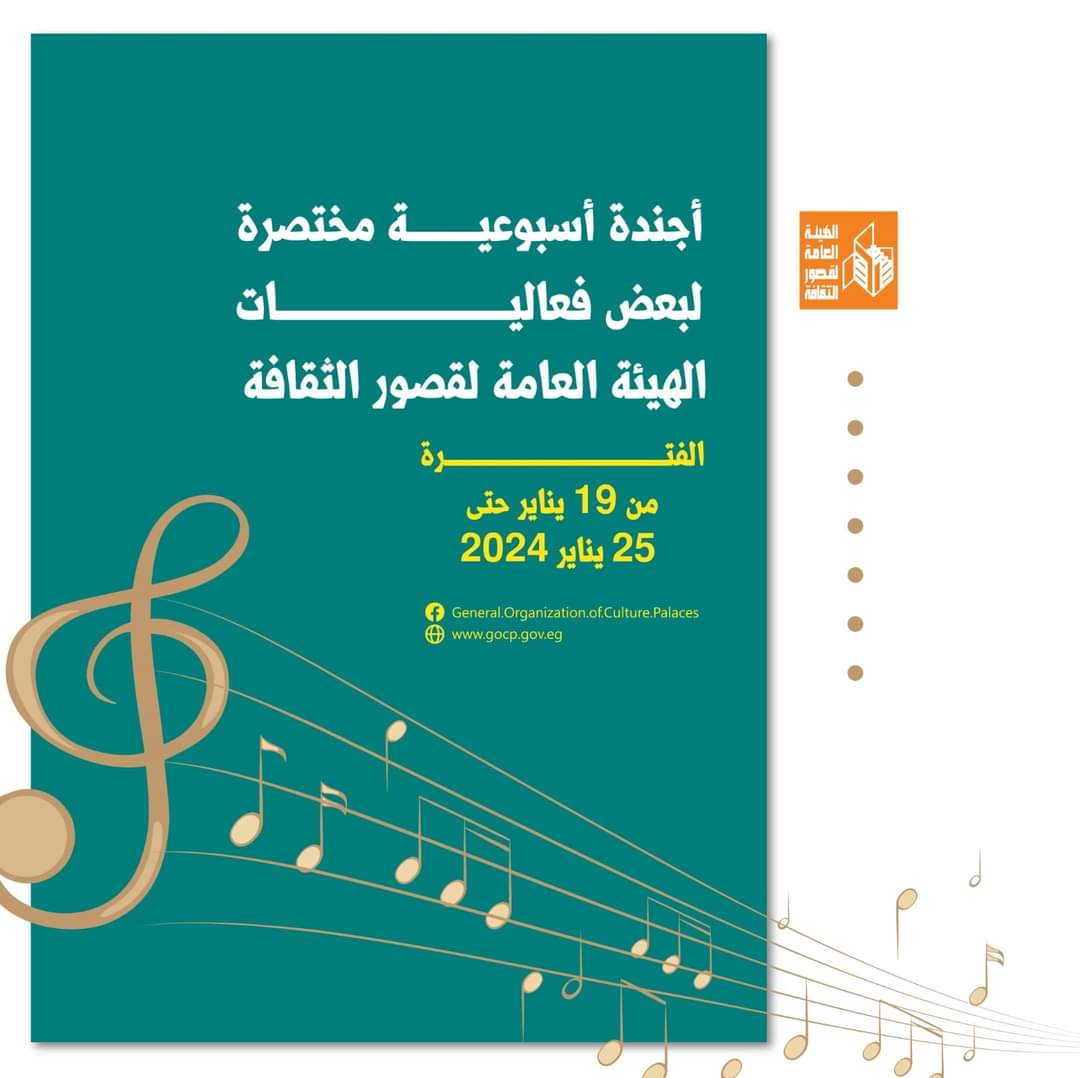 تحفل أجندة الهيئة العامة لقصور الثقافة برئاسة عمرو البسيوني، هذا الأسبوع بمجموعة متنوعة من الفعاليات الثقافية والفنية، ضمن البرنامج المعد برعاية وزارة الثقافة، بدءا من اليوم الجمعة 19 يناير وحتى الخميس المقبل 25 يناير.
