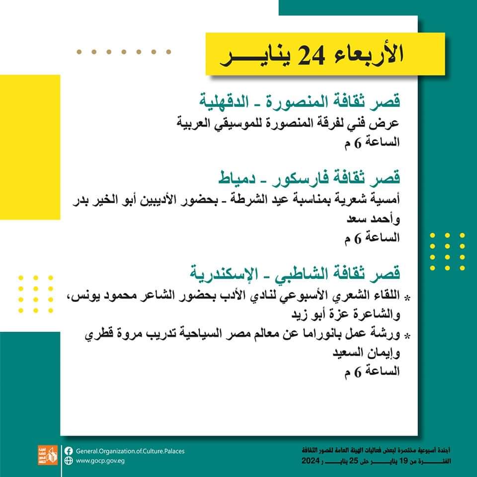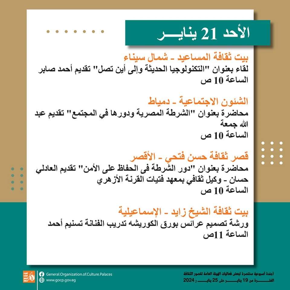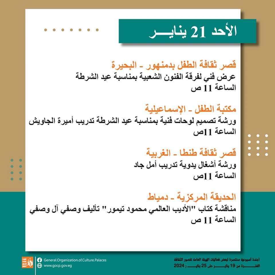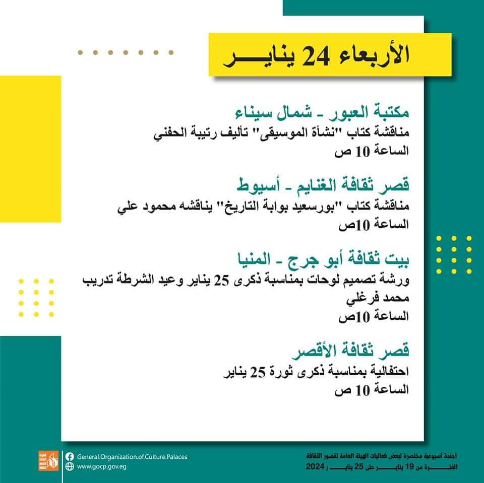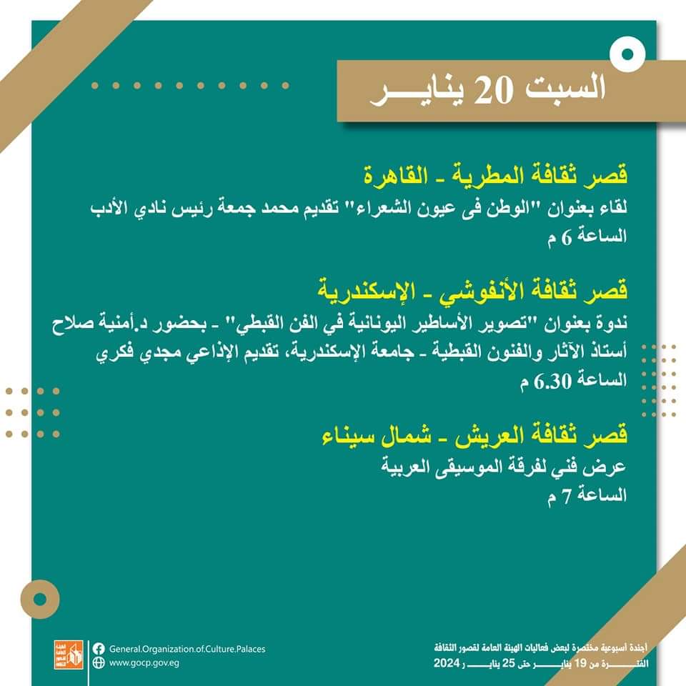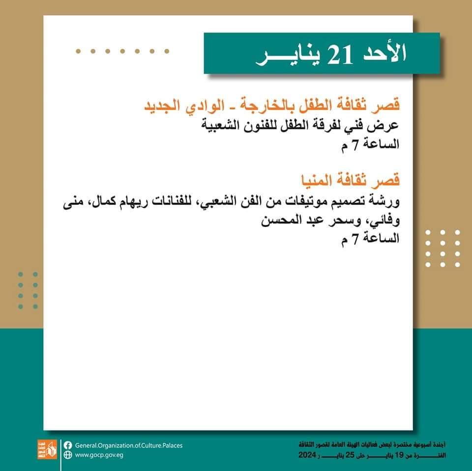 تحفل أجندة الهيئة العامة لقصور الثقافة برئاسة عمرو البسيوني، هذا الأسبوع بمجموعة متنوعة من الفعاليات الثقافية والفنية، ضمن البرنامج المعد برعاية وزارة الثقافة، بدءا من اليوم الجمعة 19 يناير وحتى الخميس المقبل 25 يناير.