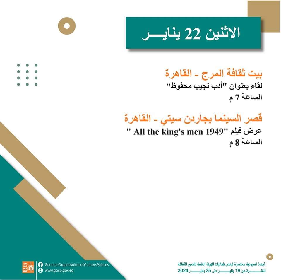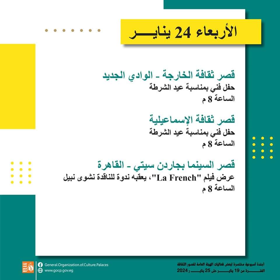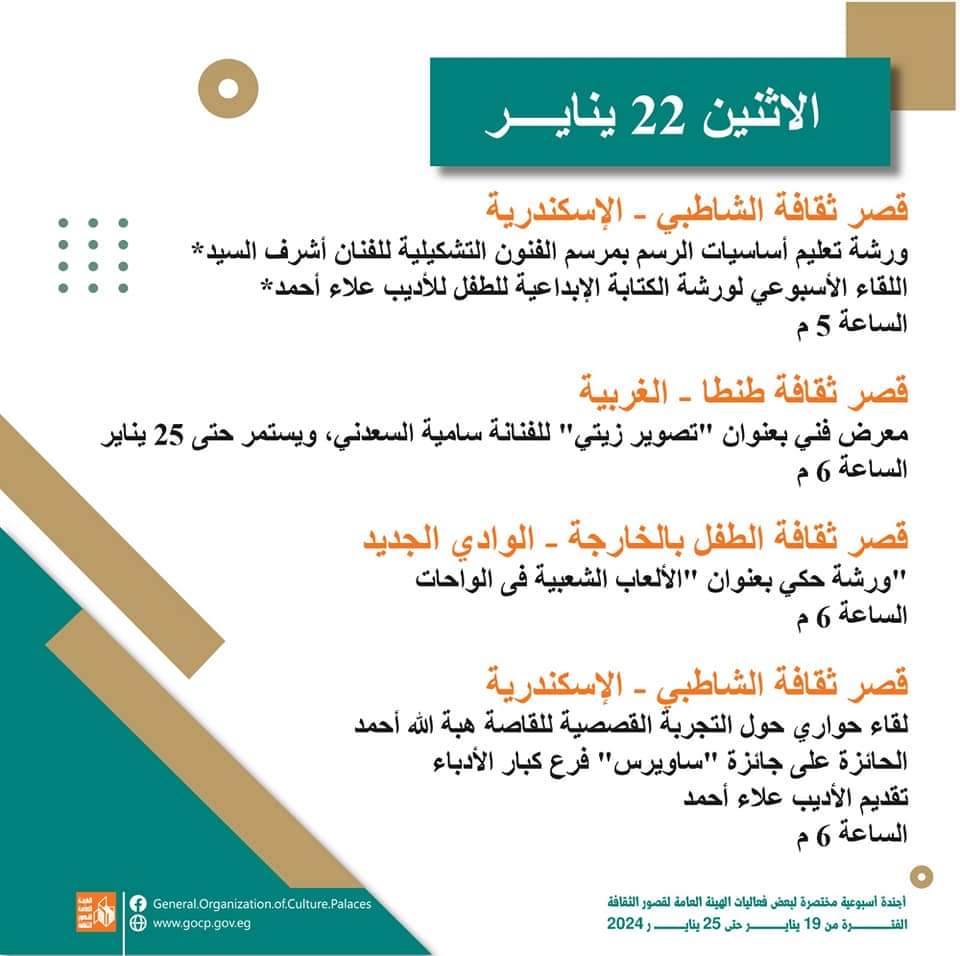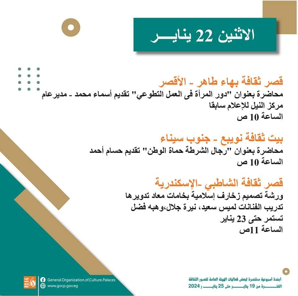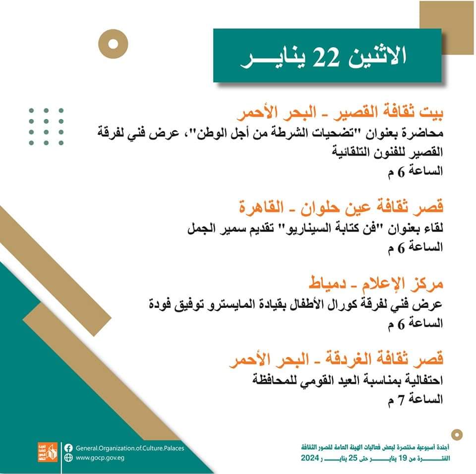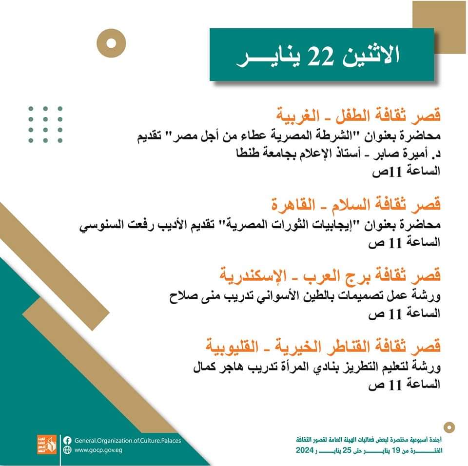 تحفل أجندة الهيئة العامة لقصور الثقافة برئاسة عمرو البسيوني، هذا الأسبوع بمجموعة متنوعة من الفعاليات الثقافية والفنية، ضمن البرنامج المعد برعاية وزارة الثقافة، بدءا من اليوم الجمعة 19 يناير وحتى الخميس المقبل 25 يناير.