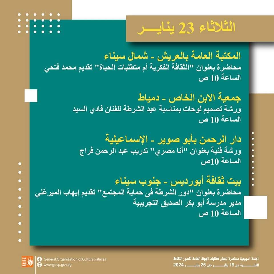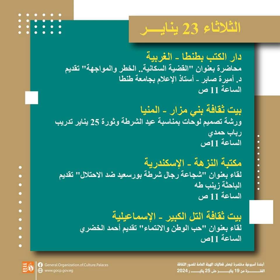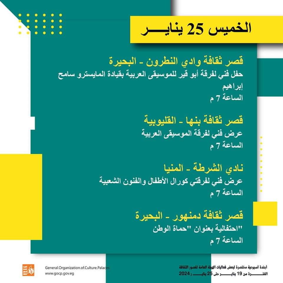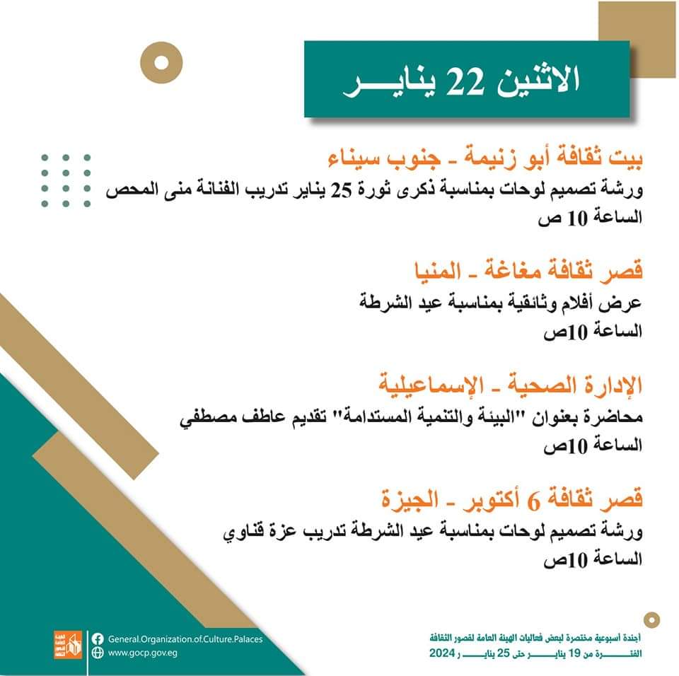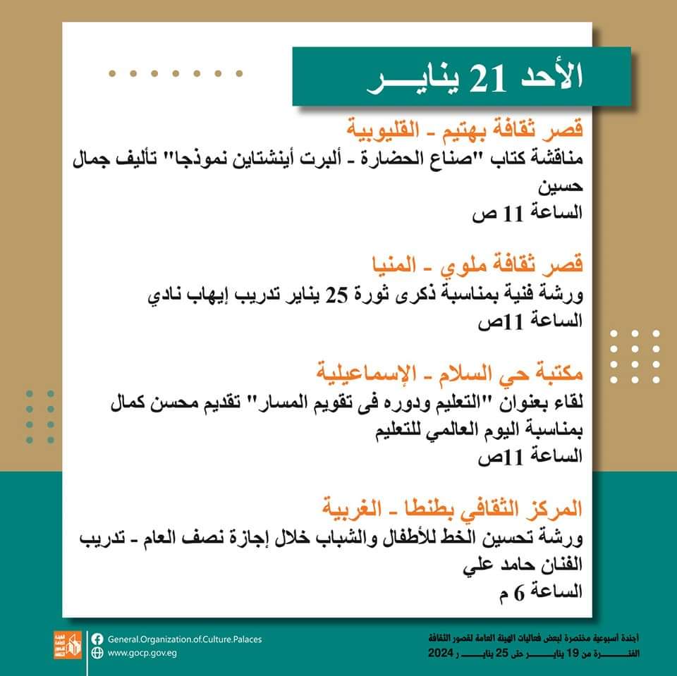 وفي اليوم ذاته تشهد محافظة المنيا فعاليات اللقاء الأسبوعي لبرنامج تعزيز قيم وممارسات المواطنة لمواجهة التطرف، والذي تنظمه الهيئة ضمن برنامج وزارة الثقافة المقدم بالتعاون مع محافظة المنيا، بهدف تعزيز القيم الإيجابية في المجتمع والوصول بالخدمات الثقافية للقرى الأكثر احتياجا.