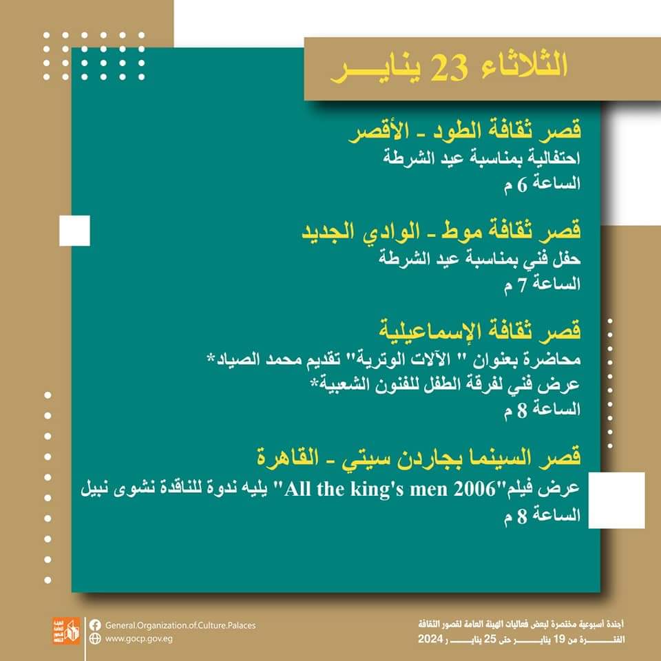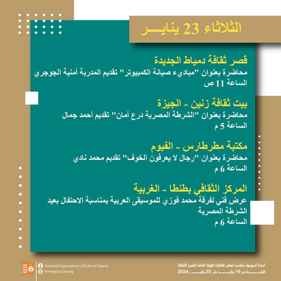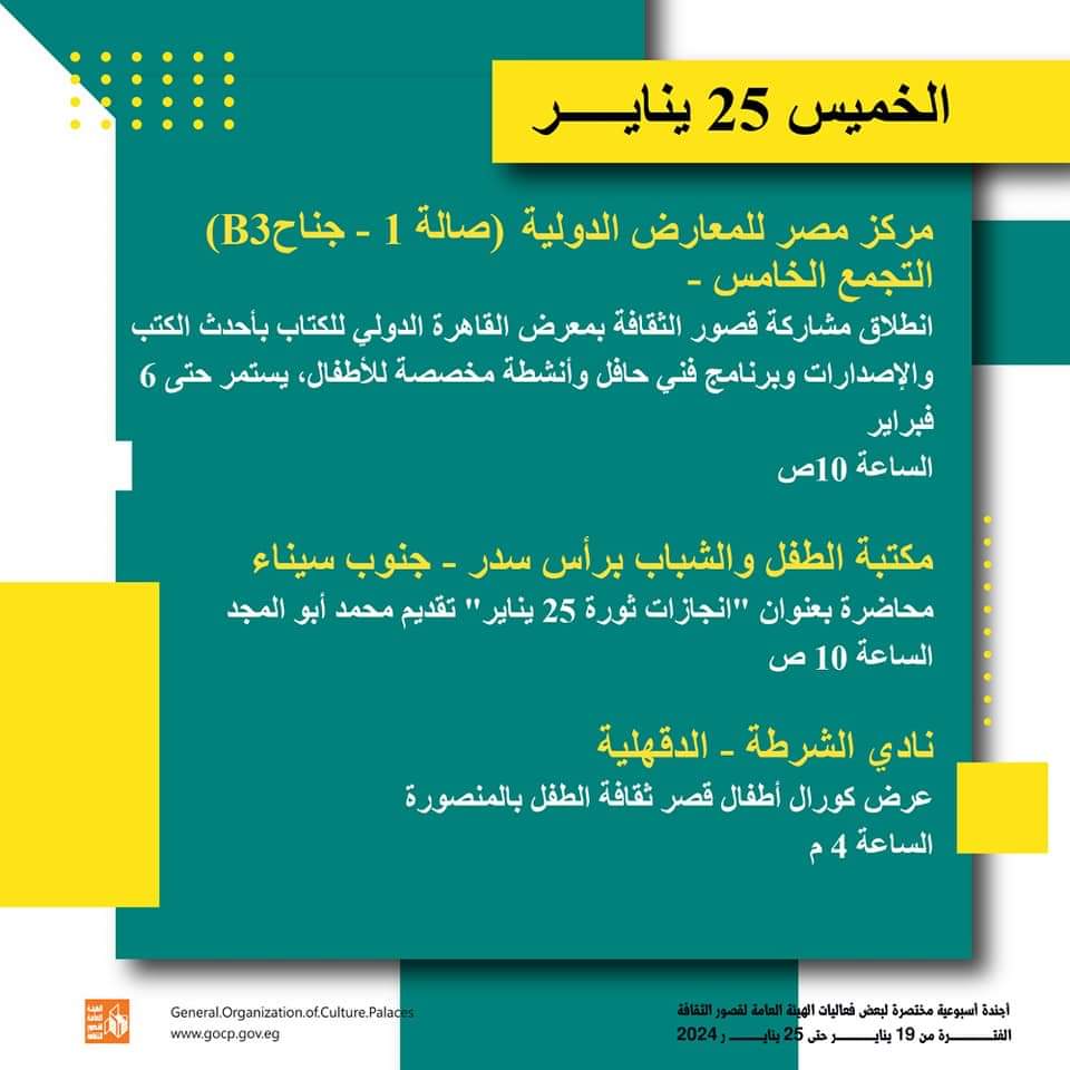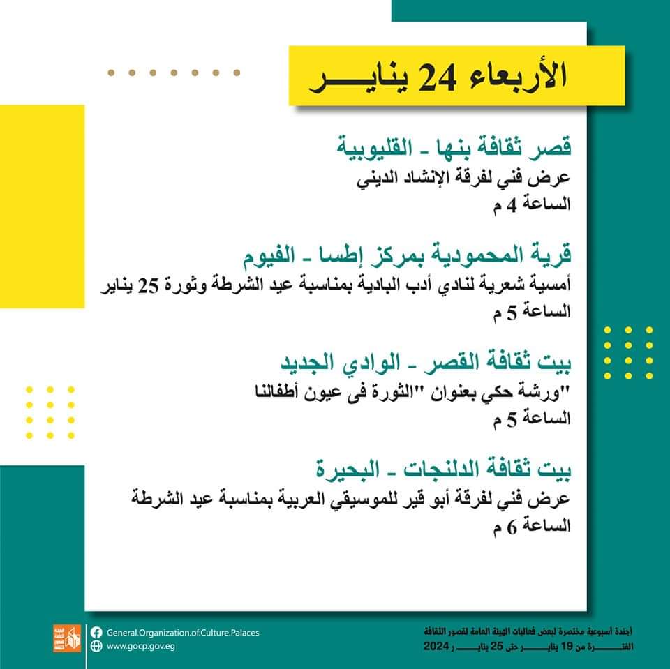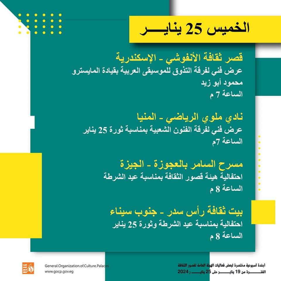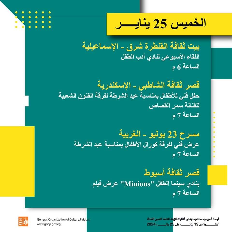 أجندة قصور الثقافة | احتفالية عيد الشرطة بمسرح السامر وإصدارات حديثة وبرنامج فني مميز بمعرض القاهرة للكتاب