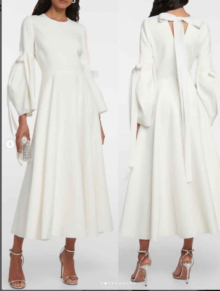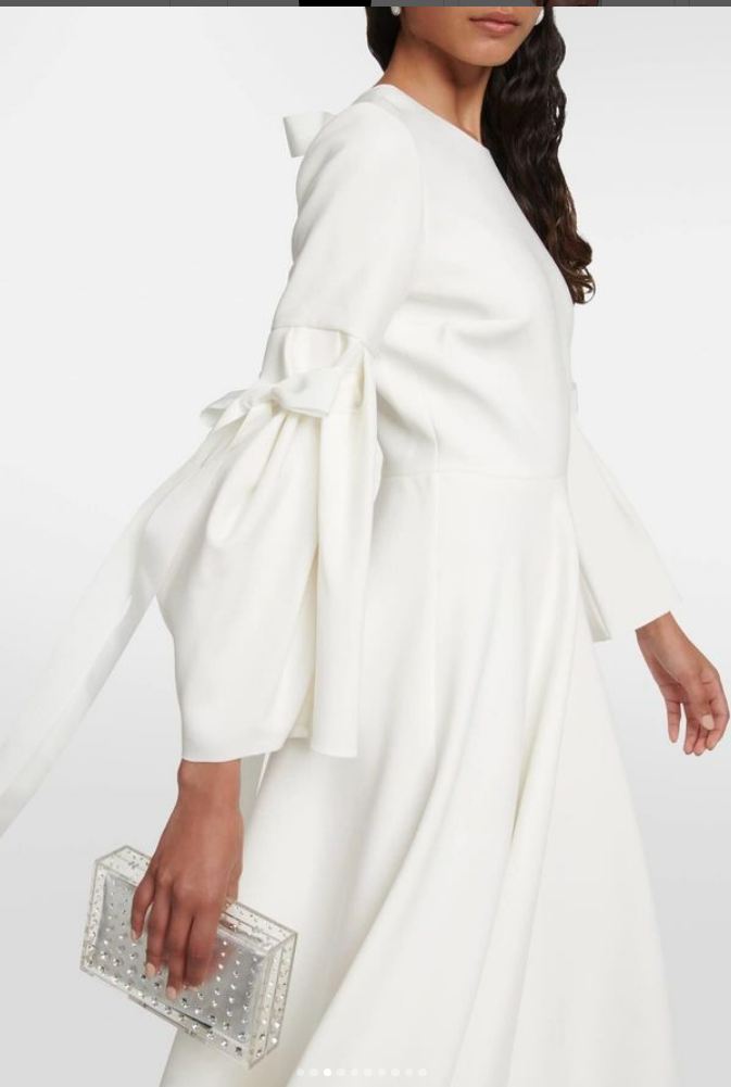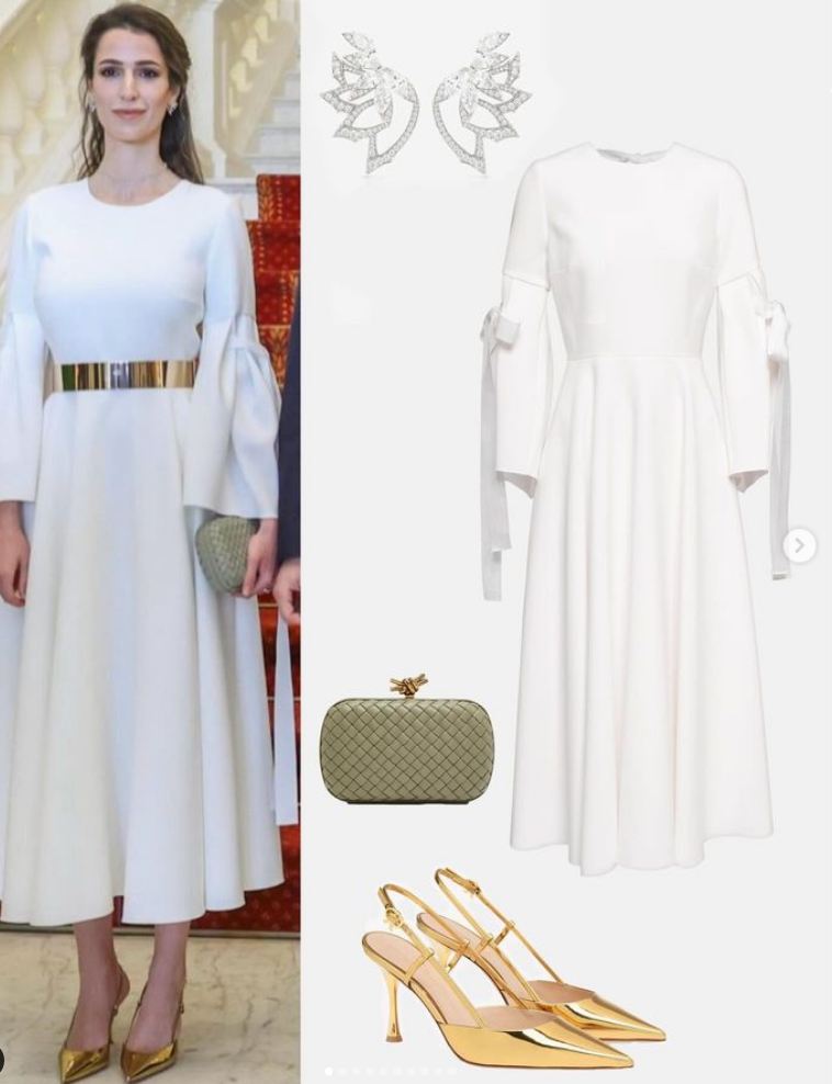 وتألقت رجوة الحسين بإطلالة جذابة ناعمة، حيث ارتدت فستان روكساندا "كالمينا" طويل مجسم وفضفاض بأكمام طويلة واسعه صمم الفستان من قماش الكريب باللون الأبيض يتوسطته حزام عريض حول خصرها، فيما انتعلت صندلًا بكعب عال.
