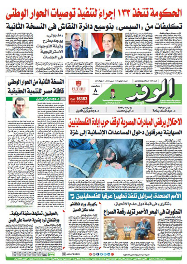 تنشر جريدة الوفد في عددها الصادر، غدًا السبت، العديد من الموضوعات والتقارير الإخبارية المهمة، أبرزها: "الحكومة تتخذ 133 إجراء لتنفيذ توصيات الحوار الوطني".