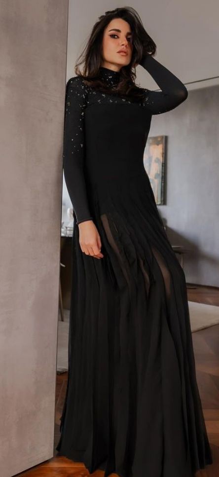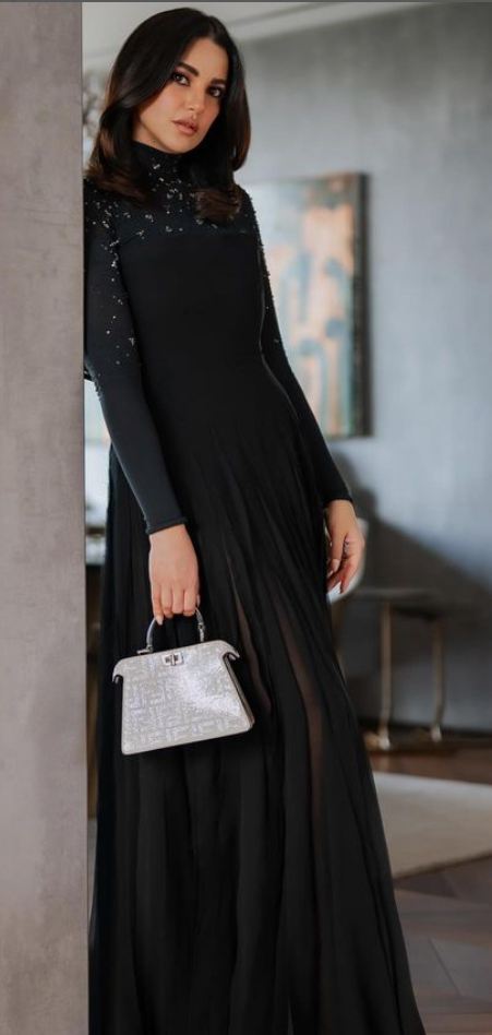وظهرت درة بإطلالة ساحرة، حيث ارتدت فستان طويل مجسم من اعلى وفضفاض من أسفل، صمم من المخمل مع التل الشفاف مما عكس البطانة القصيره تحته باللون الأسود، طرز ببعض الخرز من الأمام.