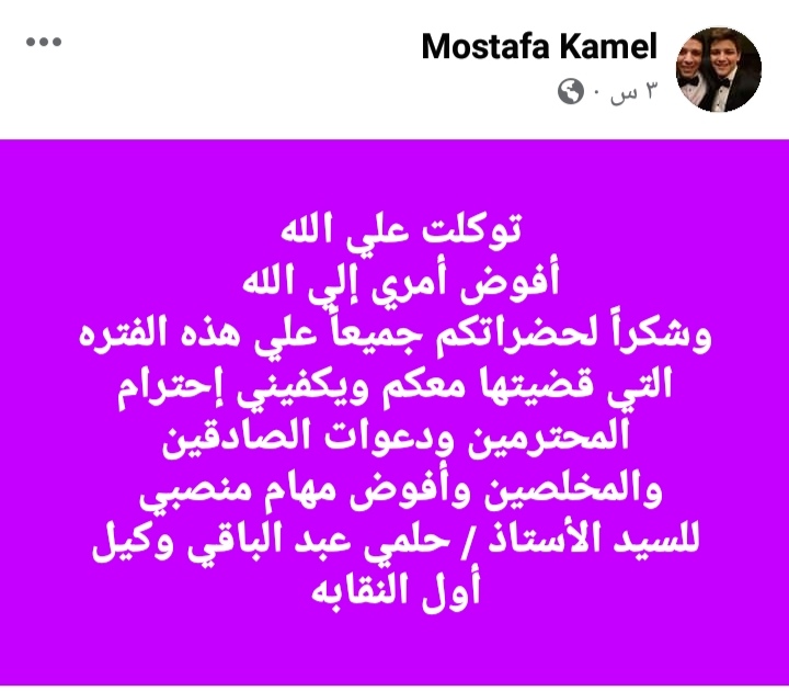 وكتب مصطفى كامل: "توكلت علي الله أفوض أمري إلي الله وشكراً لحضراتكم جميعاً هذه الفتره التي قضيتها معكم ويكفيني إحترام المحترمين ودعوات الصادقين والمخلصين".
