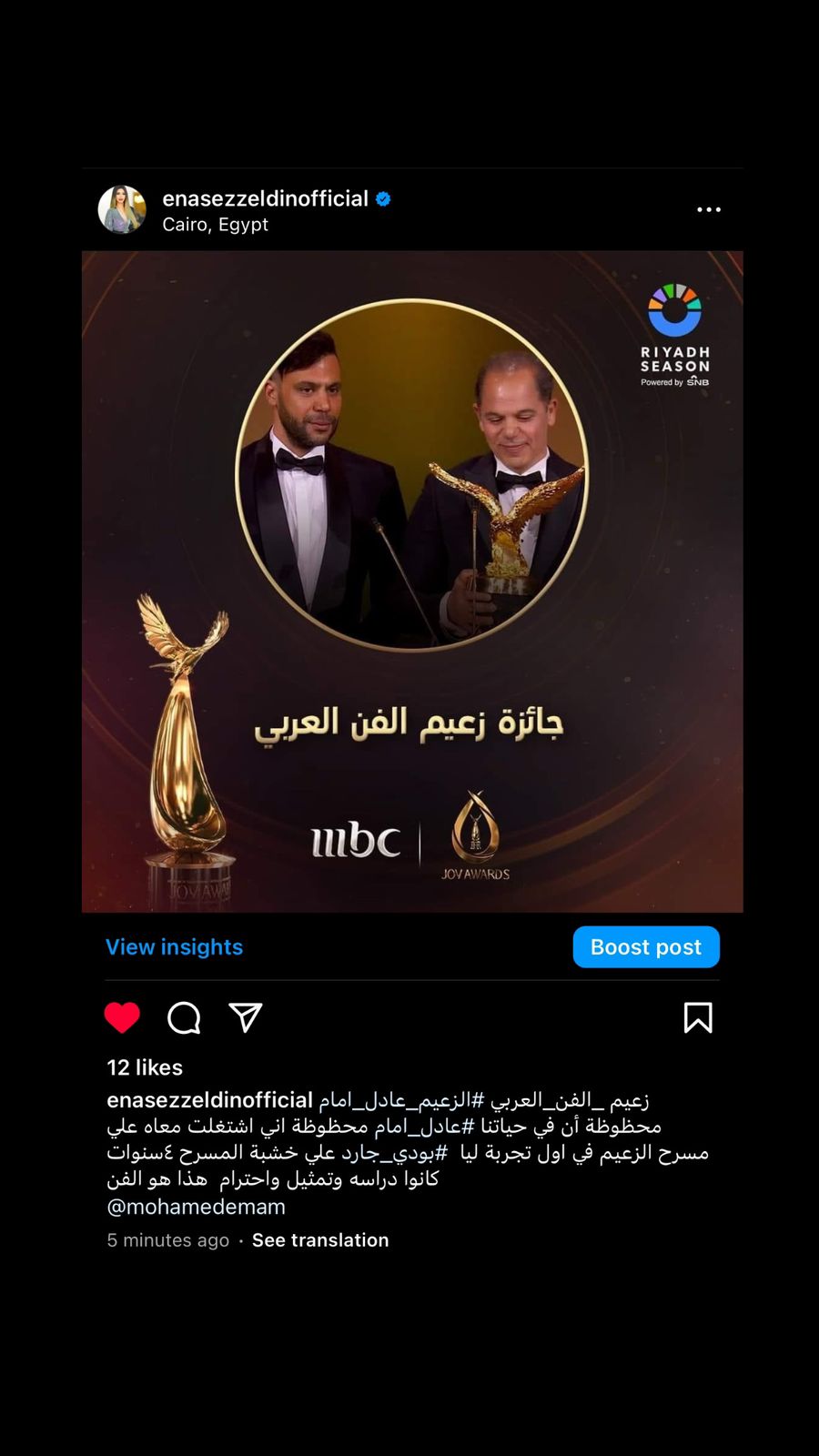 ونشرت إيناس عزالدين عبر ستوري "إنستجرام"، وعلقت عليها قائلة: "شكرًا معالي المستشار تركي آل الشيخ على تكريمك للفن المصري والعربي.. زعيم الفن العربي عادل إمام محظوظة إن في حياتنا عادل إمام.. محظوظة إني اشتغلت معاه على مسرح الزعيم في أول تجربة ليا بودي جارد على خشبة المسرح.. ٤ سنوات كانوا دراسة وتمثيل واحترام.. هذا هو الفن".