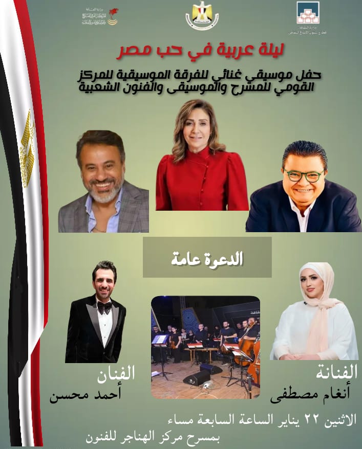 يستعد المركز القومي للمسرح والموسيقى والفنون الشعبية، برئاسة الفنان إيهاب فهمي، لاقامة حفل موسيقي غنائي بعنوان" ليلة عربية في حب مصر" تحييها فرقة المركز الموسيقية بقيادة المايسترو أحمد ماهر، وذلك في تمام الساعة السابعة مساء غدٍ، الاثنين، بمسرح الهناجر.