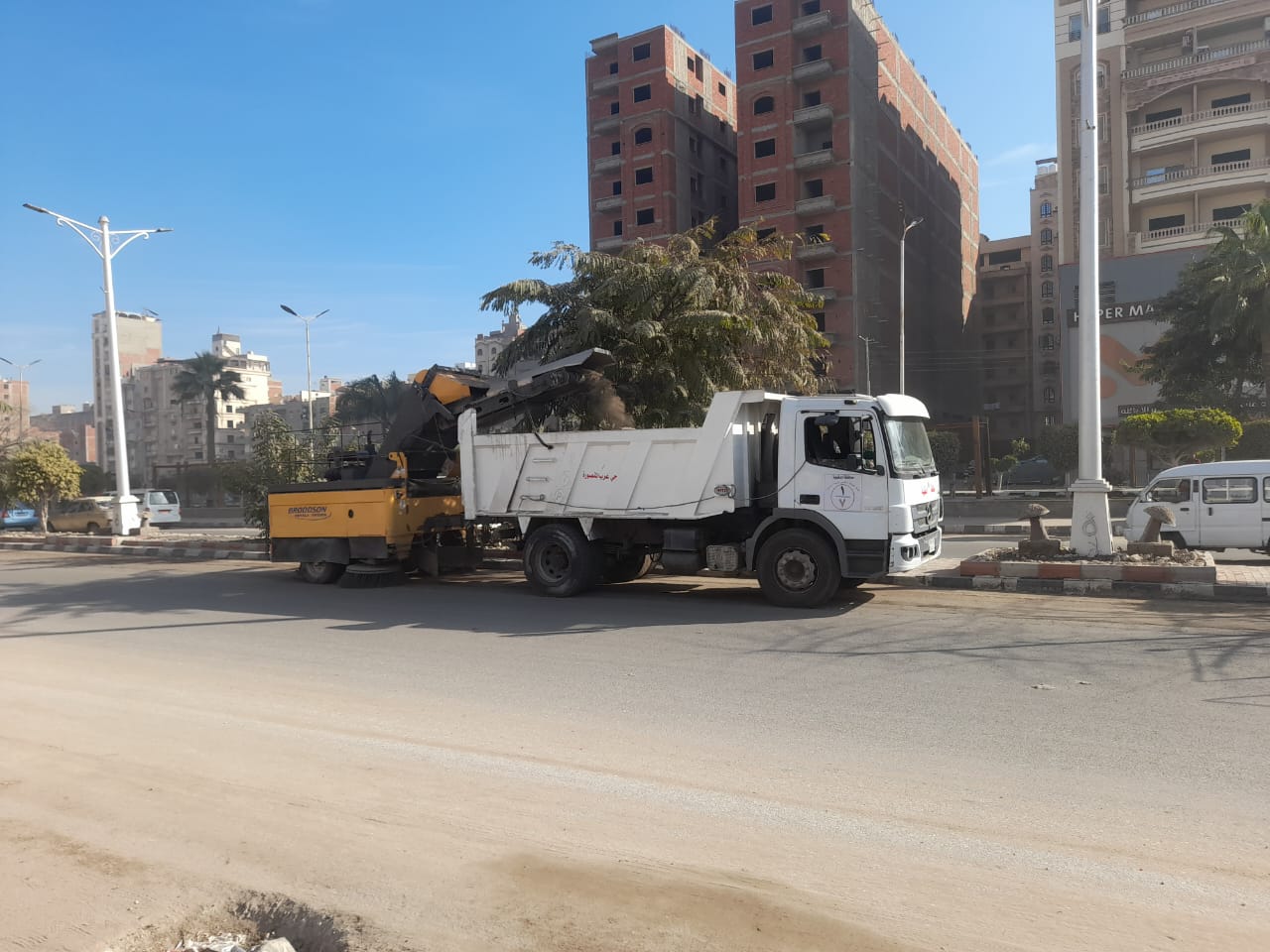 وتم دهان الأرصفة بحي الجامعة بداية من القرية الأولمبية حتى شارع توشكي وطريق ترعة المنصورية وكنس الأتربة بشارع محمود شاهين.