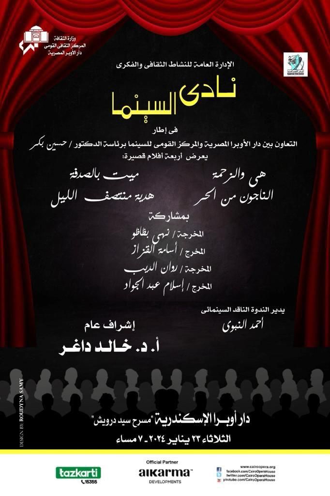 و يعرض نادى سينما أوبرا الإسكندرية اربعة افلام قصيرة هى ميت بالصدفة، هدية منتصف الليل، الناجون من الحر، هى والزحمة، ومن المقرر أن يعقبها ندوة للمناقشة بمشاركة المخرجين نهى بظاظو، أسامة القزاز، روان الديب وإسلام عبد الجواد.