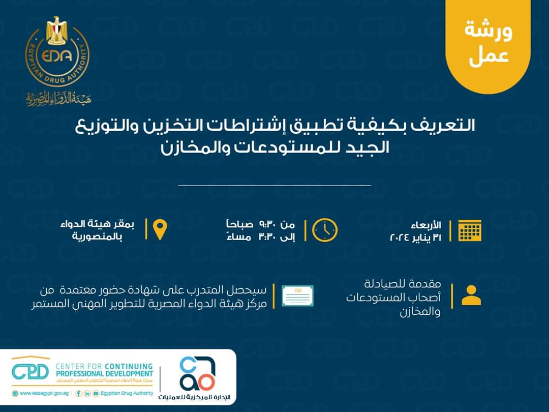 تنظم هيئة الدواء المصرية ورشة عمل للتعريف باشتراطات التخزين والتوزيع الجيد الواجب توافرها للمخازن والمستودعات وكذلك إجراءات التفتيش المتبعة لإحكام الرقابة على سوق الدواء المصري، مع توضيح للمخالفات الأكثر شيوعًا طبقًا لاشتراطات التخزين والتوزيع الجيد العالمية لرفع كفاءة المخازن والمستودعات ولضمان توافر مستحضرات طبية آمنة وفعالة وذات جودة عالية في السوق المصري.