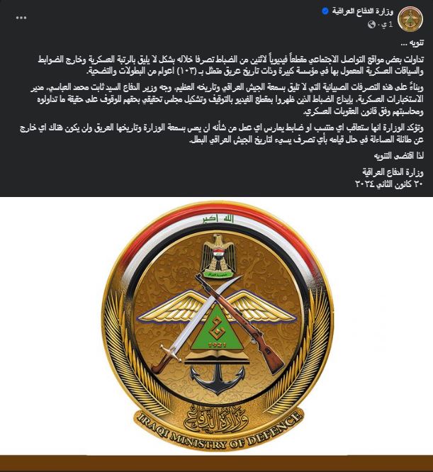 علقت وزارة الدفاع العراقية على الواقعة في منشور لها على صفحتها الرسمية قائلة.. “تداولت بعض مواقع التواصل الاجتماعي مقطع فيديو لاثنين من الضباط تصرفا خلاله بشكل لا يليق بالرتبة العسكرية وخارج الضوابط والسياقات العسكرية المعمول بها في مؤسسة كبيرة وذات تاريخ عريق متمثل بـ (١٠٣) أعوام من البطولات والتضحية”.