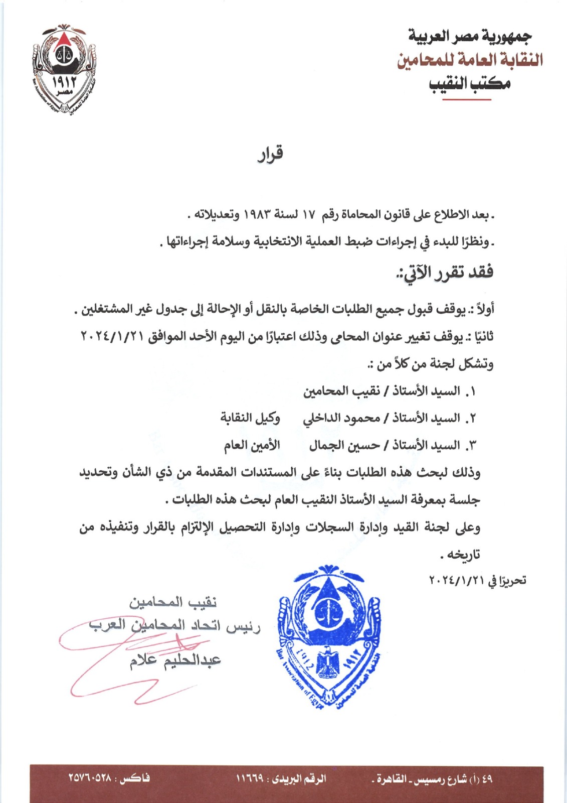 أصدر عبدالحليم علام نقيب المحامين، رئيس اتحاد المحامين العرب، قرارًا بوقف قبول جميع الطلبات الخاصة بالنقل أو الإحالة إلى جدول غير المشتغلين، ووقف تغيير عنوان المحامي، وذلك اعتبارًا من أمس الأحد 21 يناير 2024.