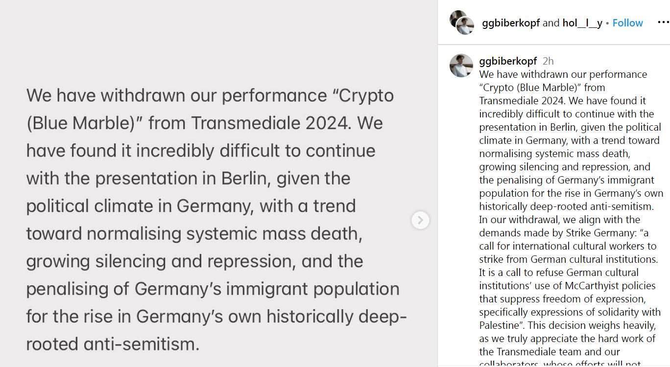 تضامنًا مع حركة  Strike German التي تدعو لمقاطعة مختلف المؤسسات الثقافية الألمانية الداعمة للكيان الصهيوني، أعلن القائمين على فيلم Crypto (Blue Marble) سحب العرض من فعاليات المهرجان وذلك عبر بيان رسمي على موقع تبادل الصور والفيديوهات “انستجرام”.