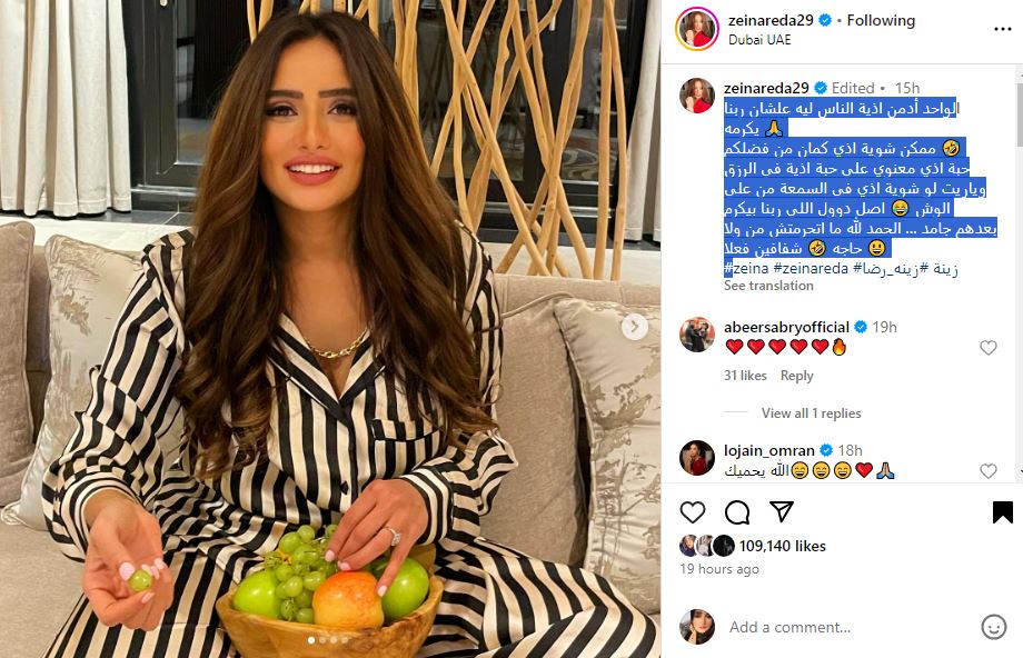 وكتبت زينة: "الواحد أدمن اذية الناس ليه علشان ربنا يكرمه ، ممكن شوية اذي كمان من فضلكم، حبة اذي معنوي علي حبة اذية في الرزق وياريت لو شوية اذي في السمعة من علي الوش".