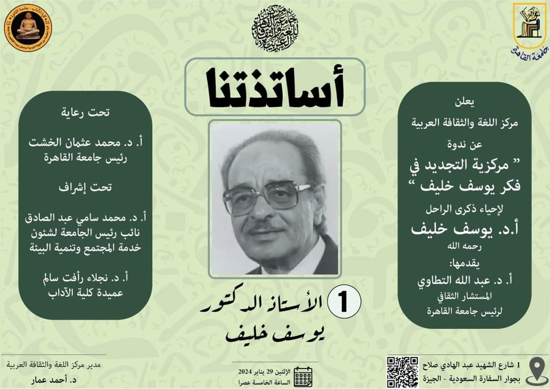 وتقام أولي ندوات مشروع "أساتذتنا" يوم الإثنين ٢٩ يناير ٢٠٢٤ من الخامسة إلى السابعة مساء حول إحياء ذكرى الإستاذ الجليل والأديب الكبير الدكتور يوسف خليف.