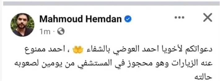 وكتب حمدان: "دعواتكم لأخويا أحمد العوضي بالشفاء، أحمد ممنوع عنه الزيارات وهو محجوز في المستشفى بقاله يومين لصعوبة حالته".