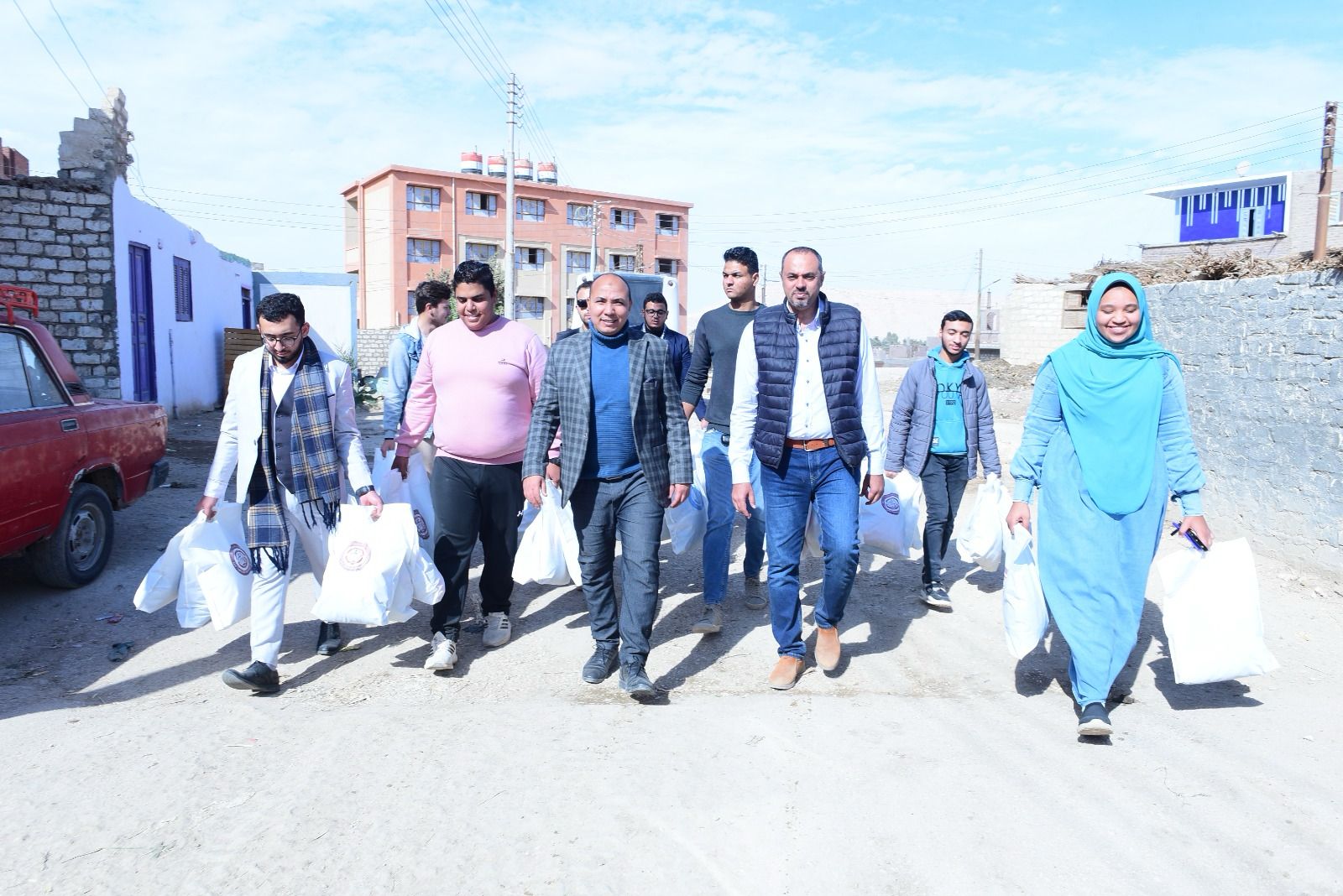 وأوضح الدكتور علاء غالب رئيس طلاب من اجل مصر، أنه شارك بفاعلية الزيارة ٥٠ طالب وطالبة من الكليات المختلفة بالجامعة، حيث قاموا بتوزيع ما يزيد عن  ١٥٠٠  قطعة من الملابس الشتوية لأعمار مختلفة وخاصة الأطفال وكبار السن، موضحاً انه تم توزيع الطلاب على  أربع مجموعات عمل كل مجموعة تضم  ١٢ طالب، معهم دليل من أهل القرية لإرشادهم  لمساعدة الفئات المستهدفة من الزيارة، وذلك في اجواء  تتسم بالألفة والمودة .