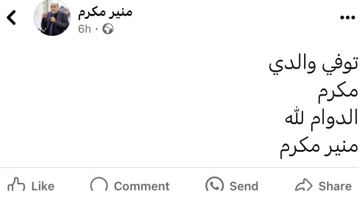 وكتب منير مكرم، عبر صفحته قائلًا: "توفي والدي مكرم الدوام لله"، وانهالت عليه التعليقات بالعزاء داعين الله أن يتغمد والده بواسع رحمته".