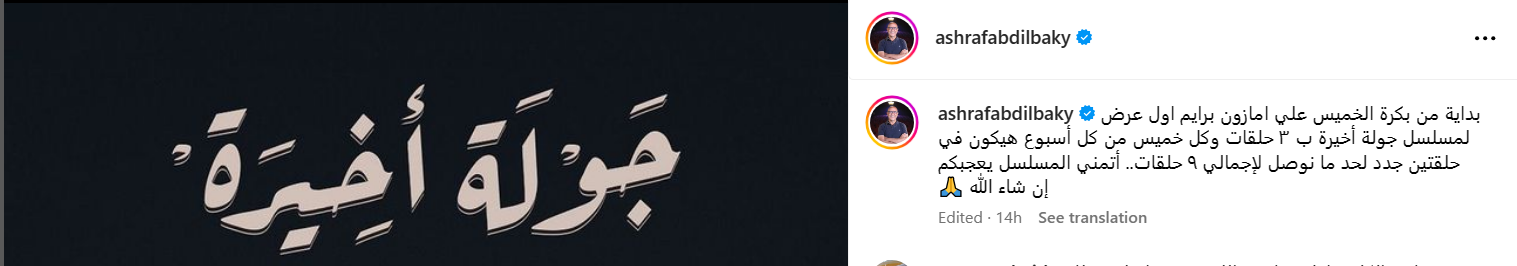 وكتب عبد الباقي أمس:" بداية من بكرة الخميس علي أمازون برايم أول عرض لمسلسل جولة أخيرة بـ ٣ حلقات وكل خميس من كل أسبوع هيكون في حلقتين جدد لحد ما نوصل لإجمالي ٩ حلقات.. أتمني المسلسل يعجبكم إن شاء الله".