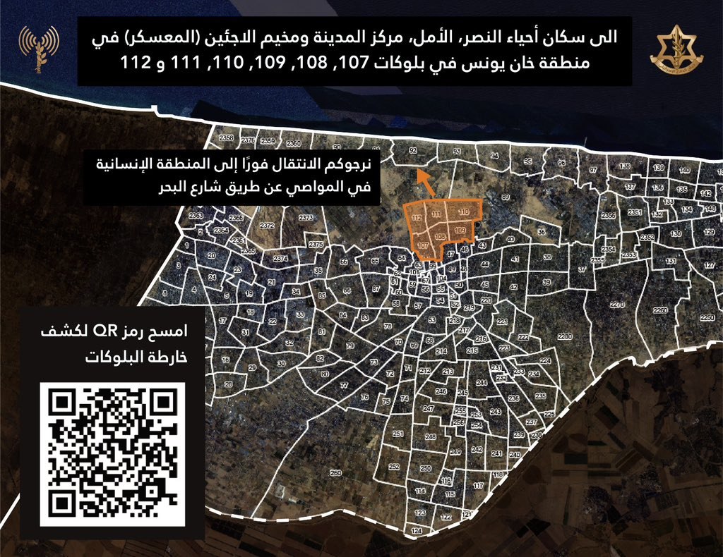 طالب المتحدث باسم جيش الاحتلال الإسرائيلي، أفيخاي أدرعي، سكان منطقة خانيونس في أحياء النصر، والأمل، ومركز المدينة والمخيم (المعسكر) في بلوكات 107-112، بالانتقال فورًا إلى المنطقة الإنسانية في المواصي عن طريق شارع البحر.