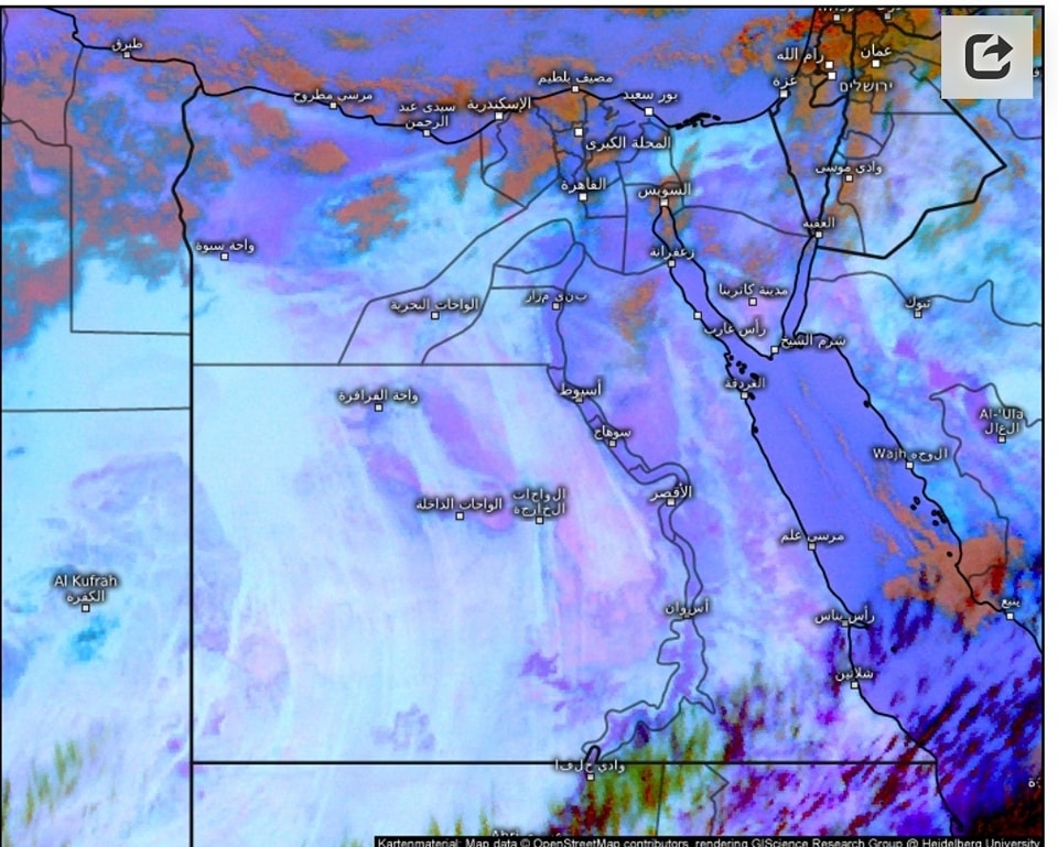 أعلنت الهيئة العامة للأرصاد الجوية عن استمرار فرص سقوط الأمطار علي السواحل الشمالية وشمال الوجه البحري تكون متوسطة الشدة تمتد خفيفة إلى متوسطة علي مناطق من جنوب الوجه البحري ومدن القناه وخليج السويس ووسط سيناء قد تمتد خفيفة إلى القاهرة.